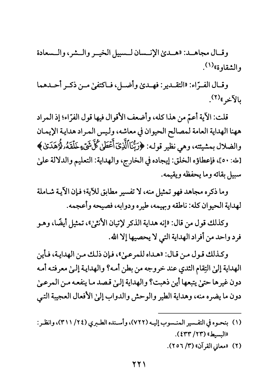 قلت: الآية أعمّ من هذا كله، وأضعف الأقوال فيها قول الفرّاء؛ إذ المراد ههنا الهداية العامة لمصالح الحيوان في معاشه، وليس المراد هداية الإيمان والضلال بمشيئته، وهي نظير قوله: {رَبُّنَا الَّذِي أَعْطَى كُلَّ شَيْءٍ خَلْقَهُ ثُمَّ هَدَى} [طه: ٥٠]، فإعطاؤه الخلق: إيجاده في الخارج، والهداية: التعليم والدلالة على سبيل بقائه وما يحفظه ويقيمه.