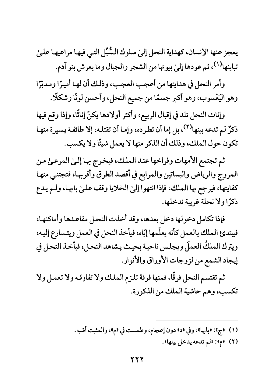 وإناث النحل تلد في إقبال الربيع، وأكثر أولادها يكنّ إناثًا، وإذا وقع فيها ذكرٌ لم تدعه بينها (¬٢)، بل إما أن تطرده، وإما أن تقتله، إلا طائفة يسيرة منها تكون حول الملك، وذلك أن الذكر منها لا يعمل شيئًا ولا يكسب.