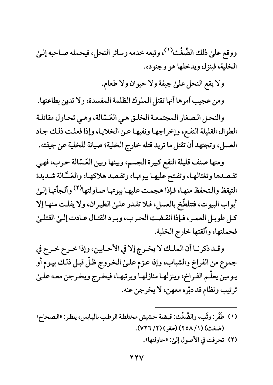 ومنها صنف قليلة النفع كبيرة الجسم، وبينها وبين العَسّالة حرب، فهي تقصدها وتغتالها، وتفتح عليها بيوتها، وتقصد هلاكها، والعَسَّالة شديدة التيقظ والتحفظ منها، فإذا هجمت عليها بيوتها صاولتها (¬٢) وألجأتها إلى أبواب البيوت، فتتلطّخ بالعسل، فلا تقدر على الطيران، ولا يفلت منها إلا كل طويل العمر، فإذا انقضت الحرب، وبرد القتال عادت إلى القتلى فحملتها، وألقتها خارج الخلية.