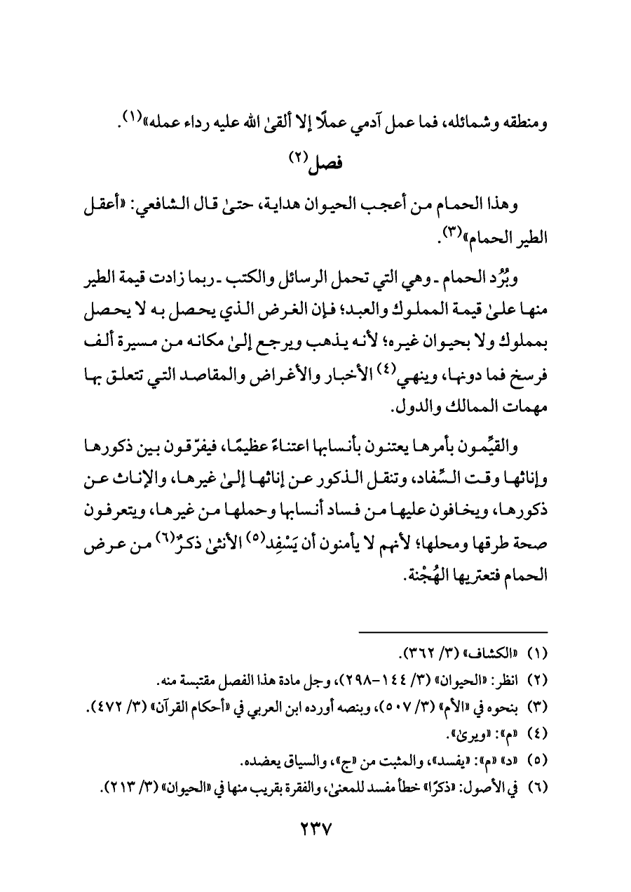 وبُرُد الحمام ـ وهي التي تحمل الرسائل والكتب ـ ربما زادت قيمة الطير منها على قيمة المملوك والعبد؛ فإن الغرض الذي يحصل به لا يحصل بمملوك ولا بحيوان غيره؛ لأنه يذهب ويرجع إلى مكانه من مسيرة ألف فرسخ فما دونها، وينهي (¬٤) الأخبار والأغراض والمقاصد التي تتعلق بها مهمات الممالك والدول.