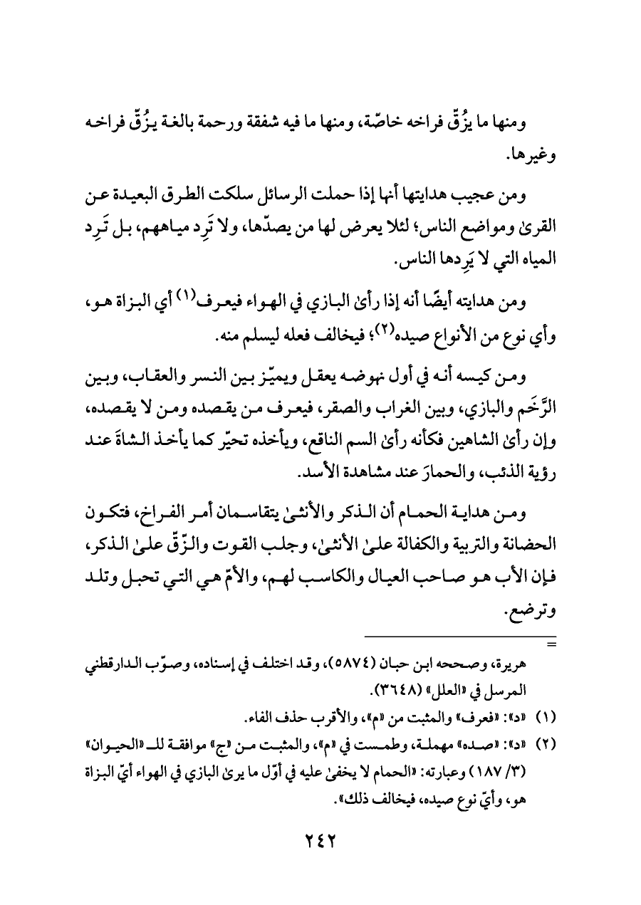 ومن عجيب هدايتها أنها إذا حملت الرسائل سلكت الطرق البعيدة عن القرى ومواضع الناس؛ لئلا يعرض لها من يصدّها، ولا تَرِد مياههم، بل تَرِد المياه التي لا يَرِدها الناس.