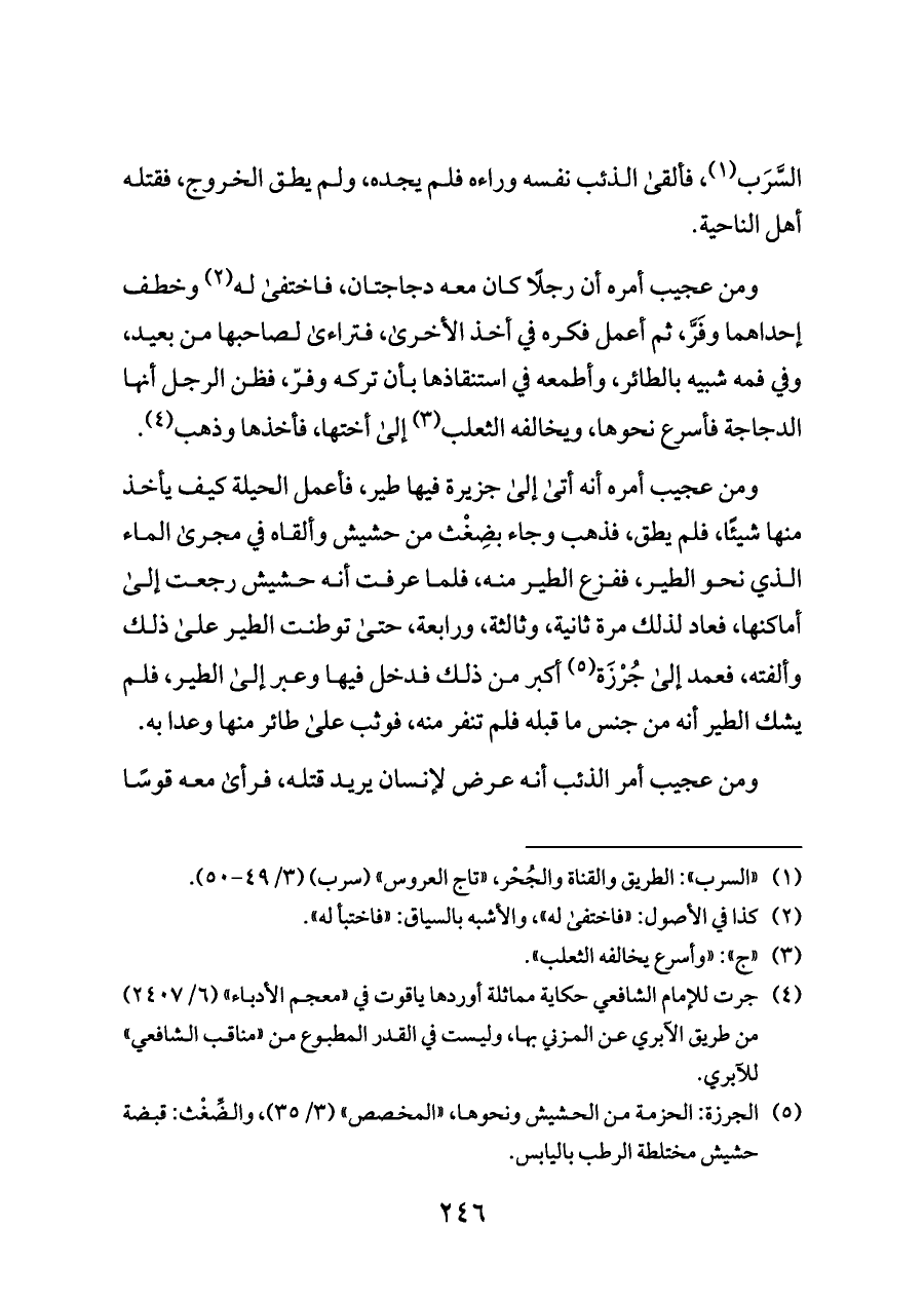 ومن عجيب أمره أن رجلًا كان معه دجاجتان، فاختفى له (¬٢) وخطف إحداهما وفَرَّ، ثم أعمل فكره في أخذ الأخرى، فتراءى لصاحبها من بعيد، وفي فمه شبيه بالطائر، وأطمعه في استنقاذها بأن تركه وفرّ، فظن الرجل أنها الدجاجة فأسرع نحوها، ويخالفه الثعلب (¬٣) إلى أختها، فأخذها وذهب (¬٤).