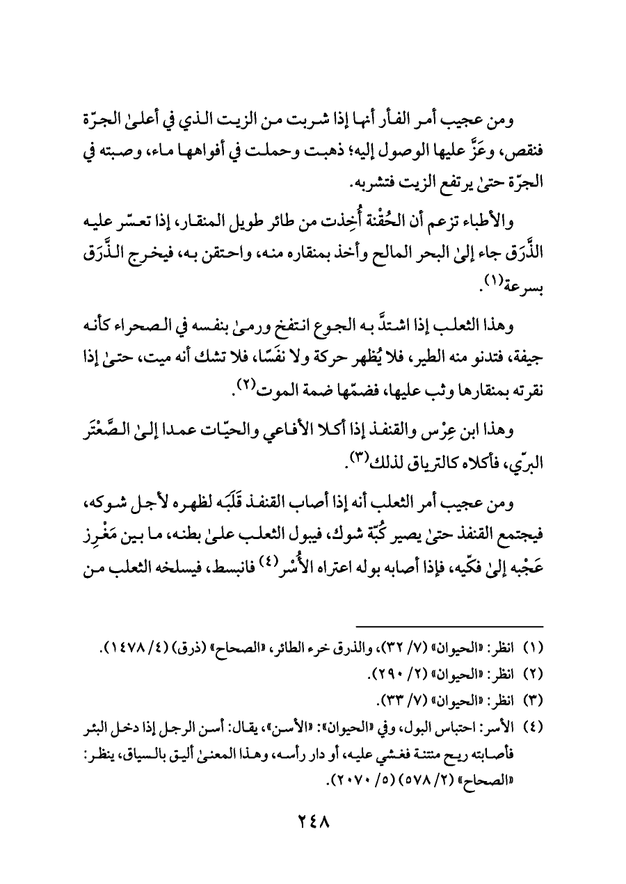 ومن عجيب أمر الثعلب أنه إذا أصاب القنفذ قَلَبَه لظهره لأجل شوكه، فيجتمع القنفذ حتى يصير كُبّة شوك، فيبول الثعلب على بطنه، ما بين مَغْرِز عَجْبه إلى فكّيه، فإذا أصابه بوله اعتراه الأُسْر (¬٤) فانبسط، فيسلخه الثعلب من