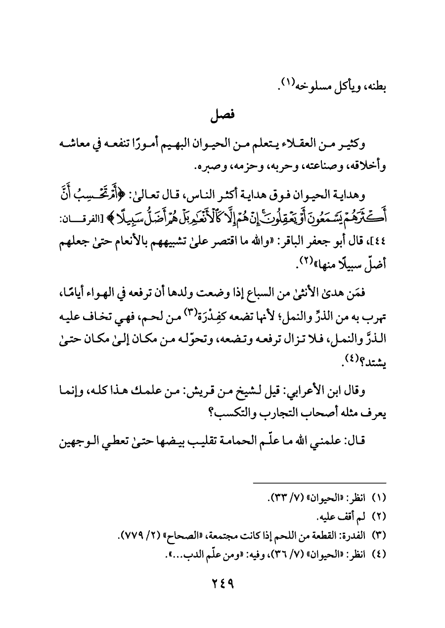 وكثير من العقلاء يتعلم من الحيوان البهيم أمورًا تنفعه في معاشه وأخلاقه، وصناعته، وحربه، وحزمه، وصبره.