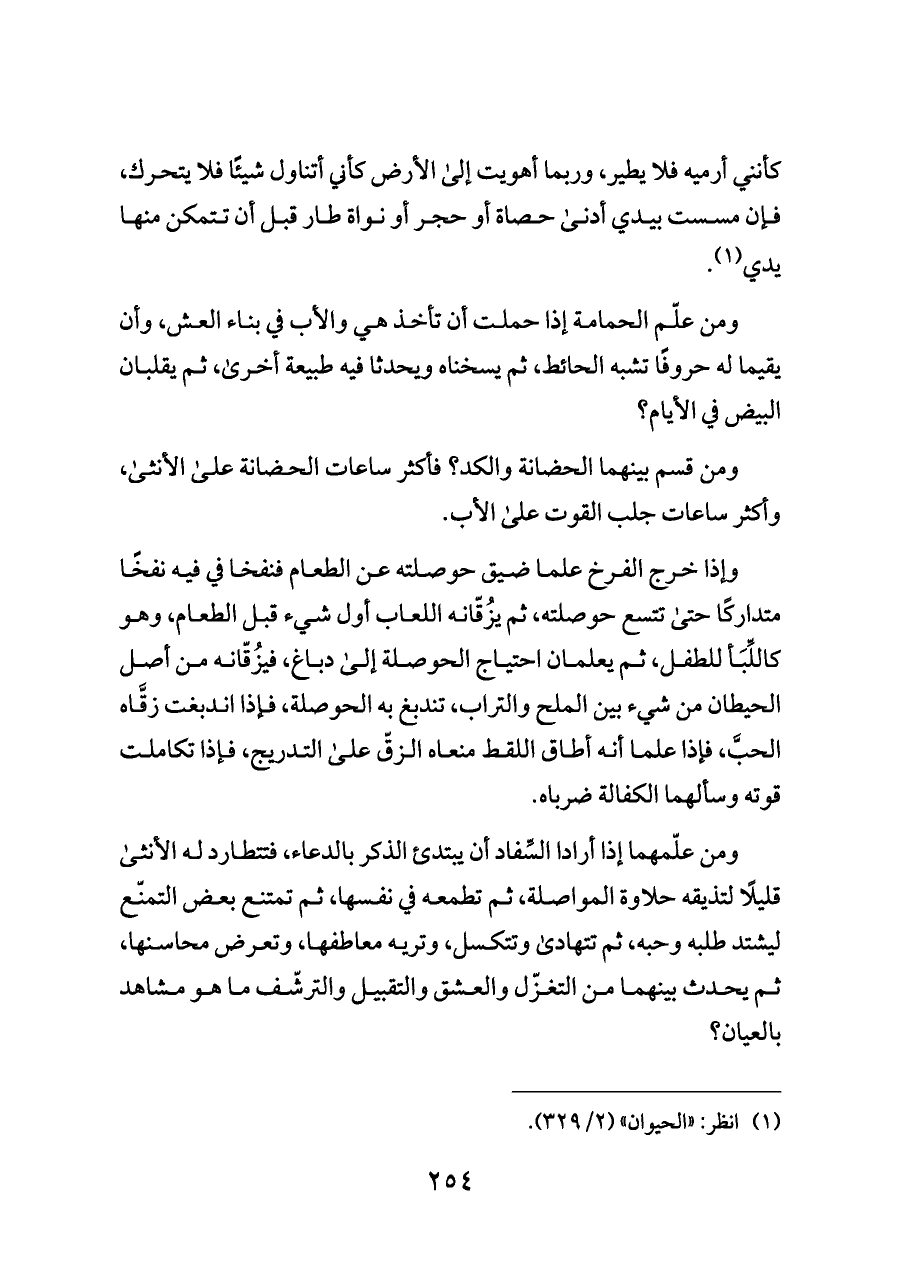 ومن علّم الحمامة إذا حملت أن تأخذ هي والأب في بناء العش، وأن يقيما له حروفًا تشبه الحائط، ثم يسخناه ويحدثا فيه طبيعة أخرى، ثم يقلبان البيض في الأيام؟