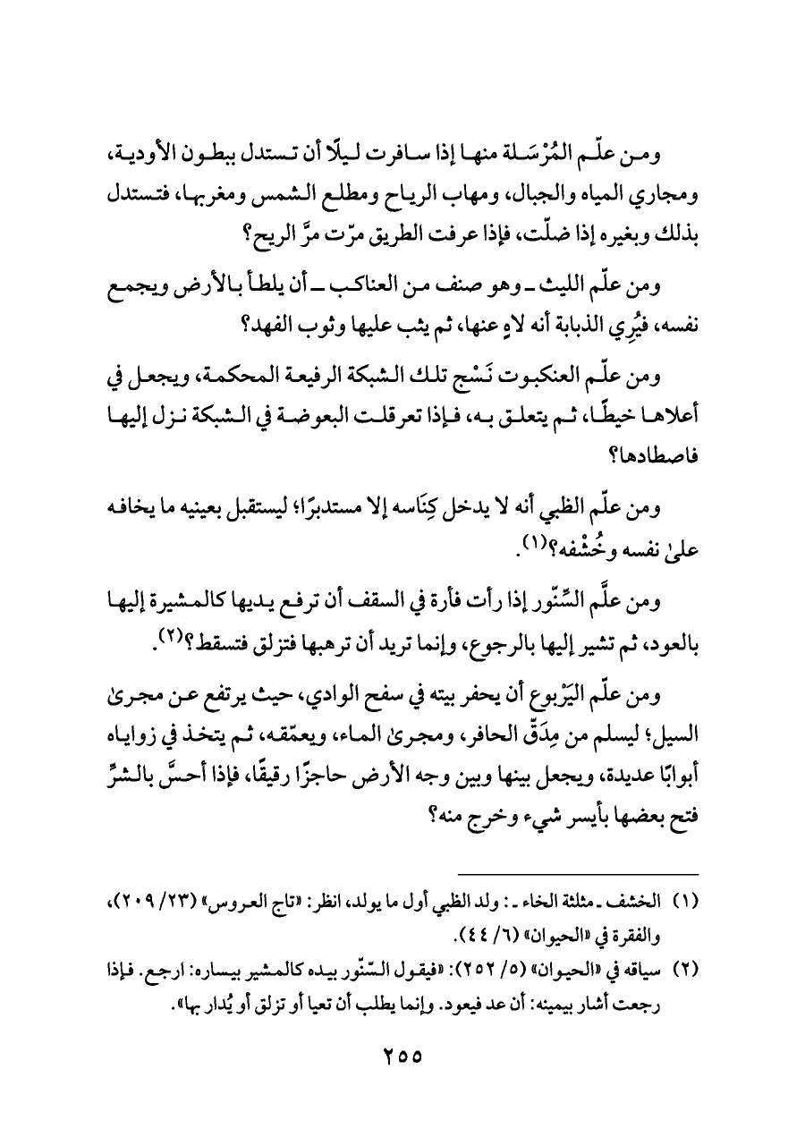 ومن علّم الليث ــ وهو صنف من العناكب ــ أن يلطأ بالأرض ويجمع نفسه، فيُرِي الذبابة أنه لاهٍ عنها، ثم يثب عليها وثوب الفهد؟