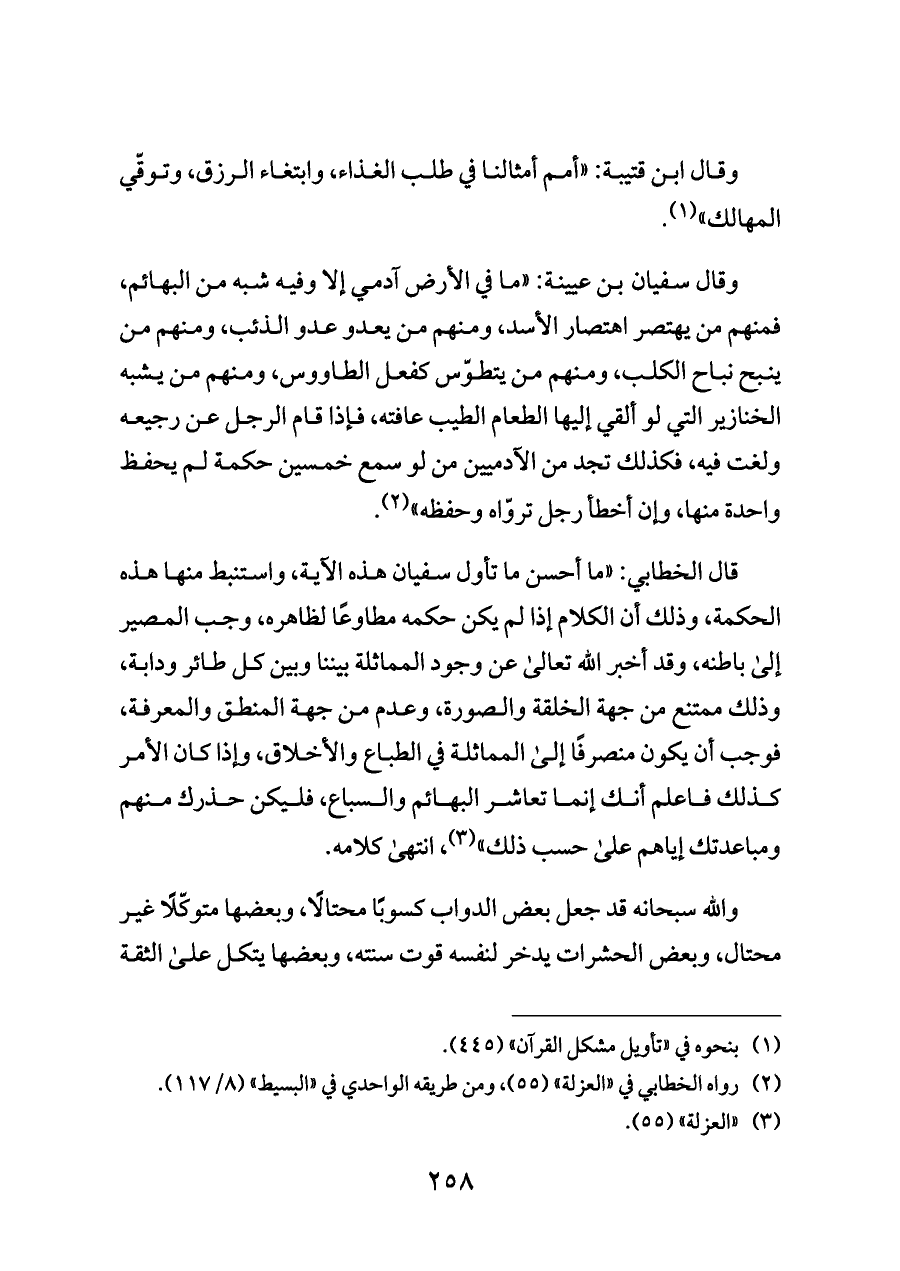 قال الخطابي: "ما أحسن ما تأول سفيان هذه الآية، واستنبط منها هذه الحكمة، وذلك أن الكلام إذا لم يكن حكمه مطاوعًا لظاهره، وجب المصير إلى باطنه، وقد أخبر الله تعالى عن وجود المماثلة بيننا وبين كل طائر ودابة، وذلك ممتنع من جهة الخلقة والصورة، وعدم من جهة المنطق والمعرفة، فوجب أن يكون منصرفًا إلى المماثلة في الطباع والأخلاق، وإذا كان الأمر كذلك فاعلم أنك إنما تعاشر البهائم والسباع، فليكن حذرك منهم ومباعدتك إياهم على حسب ذلك" (¬٣)، انتهى كلامه.
