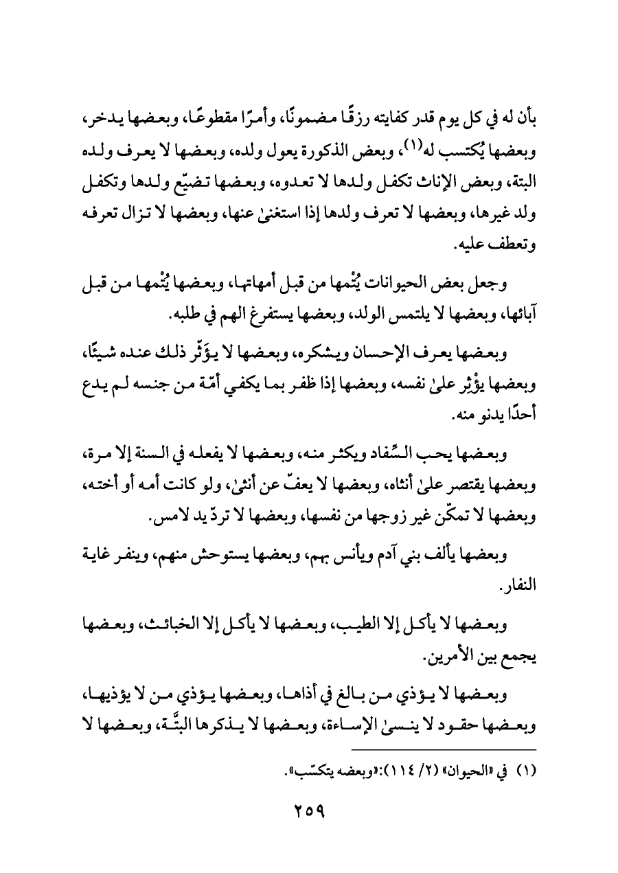 بأن له في كل يوم قدر كفايته رزقًا مضمونًا، وأمرًا مقطوعًا، وبعضها يدخر، وبعضها يُكتسب له (¬١)، وبعض الذكورة يعول ولده، وبعضها لا يعرف ولده البتة، وبعض الإناث تكفل ولدها لا تعدوه، وبعضها تضيّع ولدها وتكفل ولد غيرها، وبعضها لا تعرف ولدها إذا استغنى عنها، وبعضها لا تزال تعرفه وتعطف عليه.