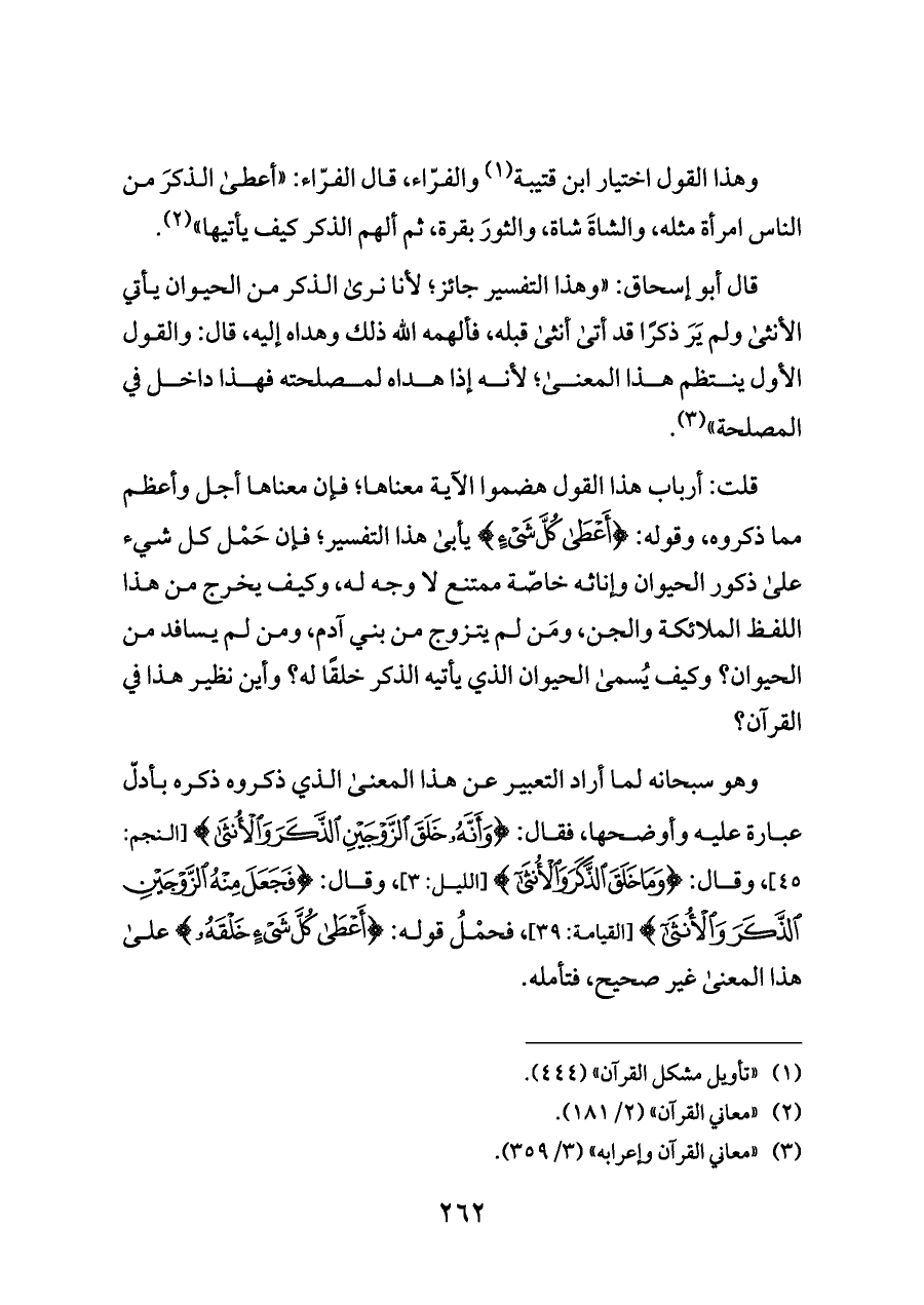 وهو سبحانه لما أراد التعبير عن هذا المعنى الذي ذكروه ذكره بأدلّ عبارة عليه وأوضحها، فقال: {وَأَنَّهُ خَلَقَ الزَّوْجَيْنِ الذَّكَرَ وَالْأُنْثَى} [النجم: ٤٥]، وقال: {وَمَا خَلَقَ الذَّكَرَ وَالْأُنْثَى} [الليل: ٣]، وقال: {فَجَعَلَ مِنْهُ الزَّوْجَيْنِ الذَّكَرَ وَالْأُنْثَى} [القيامة: ٣٩]، فحمْلُ قوله: {أَعْطَى كُلَّ شَيْءٍ خَلْقَهُ} على هذا المعنى غير صحيح، فتأمله.