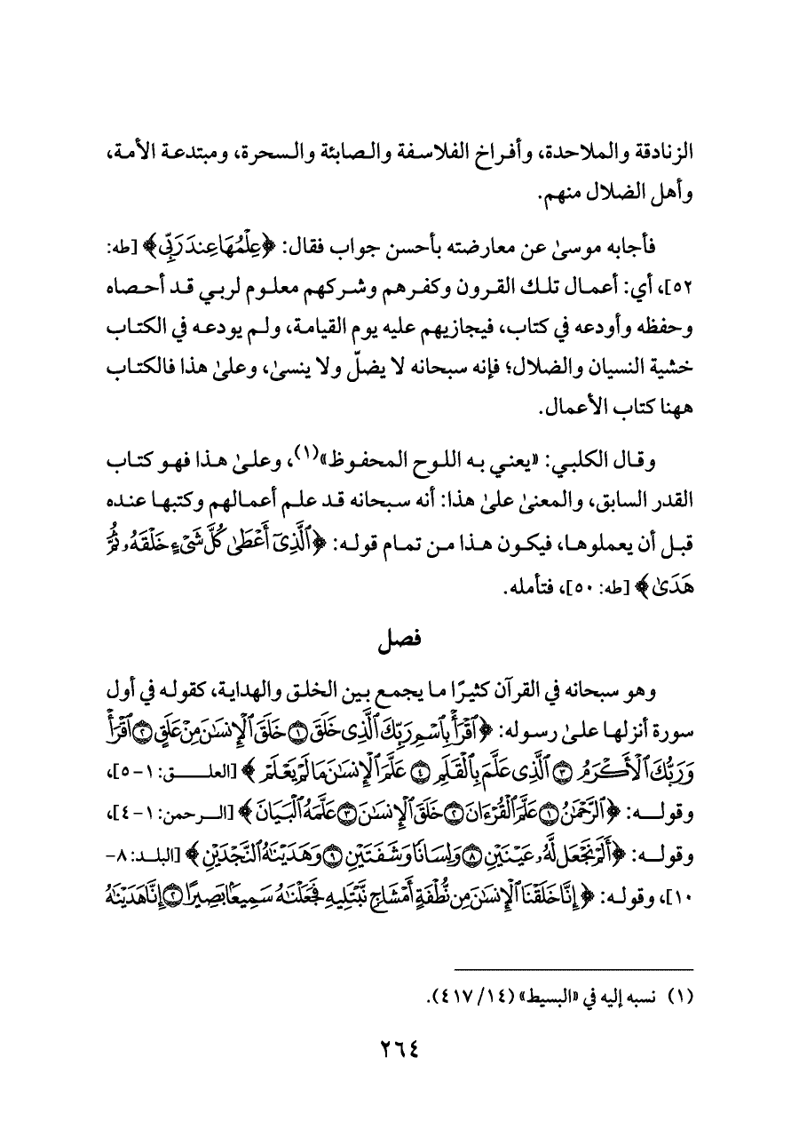 فأجابه موسى عن معارضته بأحسن جواب فقال: {عِلْمُهَا عِنْدَ رَبِّي} [طه: ٥٢]، أي: أعمال تلك القرون وكفرهم وشركهم معلوم لربي قد أحصاه وحفظه وأودعه في كتاب، فيجازيهم عليه يوم القيامة، ولم يودعه في الكتاب خشية النسيان والضلال؛ فإنه سبحانه لا يضلّ ولا ينسى، وعلى هذا فالكتاب ههنا كتاب الأعمال.