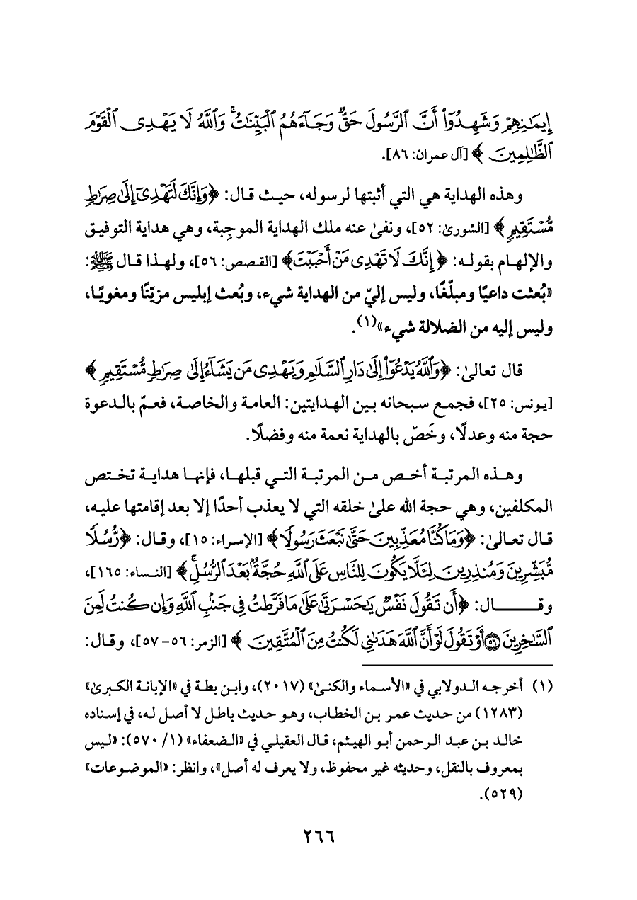 وهذه المرتبة أخص من المرتبة التي قبلها، فإنها هداية تختص المكلفين، وهي حجة الله على خلقه التي لا يعذب أحدًا إلا بعد إقامتها عليه، قال تعالى: {وَمَا كُنَّا مُعَذِّبِينَ حَتَّى نَبْعَثَ رَسُولًا} [الإسراء: ١٥]، وقال: {رُسُلًا مُبَشِّرِينَ وَمُنْذِرِينَ لِئَلَّا يَكُونَ لِلنَّاسِ عَلَى اللَّهِ حُجَّةٌ بَعْدَ الرُّسُلِ} [النساء: ١٦٥]، وقال: {أَنْ تَقُولَ نَفْسٌ يَاحَسْرَتَا عَلَى مَا فَرَّطْتُ فِي جَنْبِ اللَّهِ وَإِنْ كُنْتُ لَمِنَ السَّاخِرِينَ (٥٦) أَوْ تَقُولَ لَوْ أَنَّ اللَّهَ هَدَانِي لَكُنْتُ مِنَ الْمُتَّقِينَ} [الزمر: ٥٦ - ٥٧]، وقال: