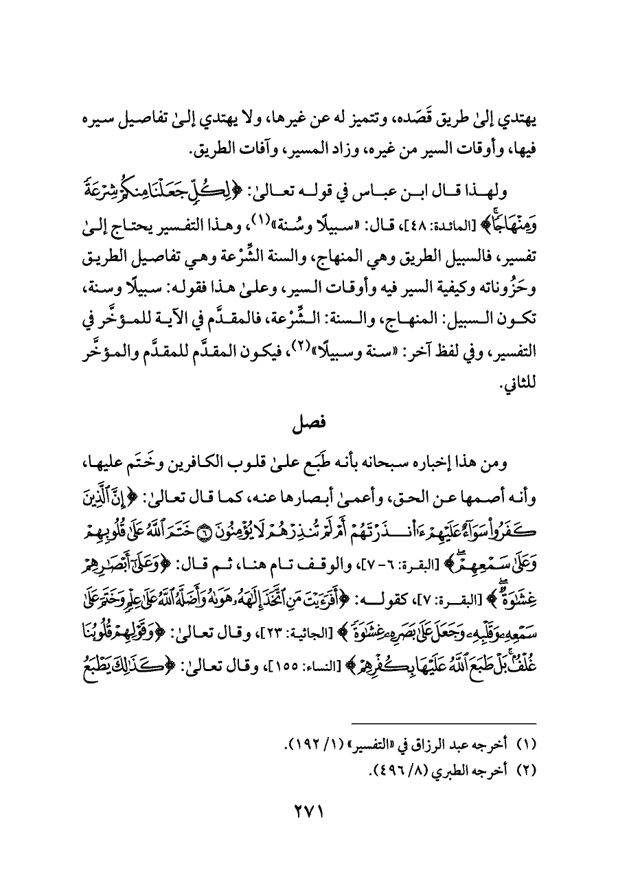 ومن هذا إخباره سبحانه بأنه طَبَع على قلوب الكافرين وخَتَم عليها، وأنه أصمها عن الحق، وأعمى أبصارها عنه، كما قال تعالى: {إِنَّ الَّذِينَ كَفَرُوا سَوَاءٌ عَلَيْهِمْ ءَانْذَرْتَهُمْ أَمْ لَمْ تُنْذِرْهُمْ لَا يُؤْمِنُونَ (٦) خَتَمَ اللَّهُ عَلَى قُلُوبِهِمْ وَعَلَى سَمْعِهِمْ} [البقرة: ٦ - ٧]، والوقف تام هنا، ثم قال: {وَعَلَى أَبْصَارِهِمْ غِشَاوَةٌ} [البقرة: ٧]، كقوله: {أَفَرَأَيْتَ مَنِ اتَّخَذَ إِلَهَهُ هَوَاهُ وَأَضَلَّهُ اللَّهُ عَلَى عِلْمٍ وَخَتَمَ عَلَى سَمْعِهِ وَقَلْبِهِ وَجَعَلَ عَلَى بَصَرِهِ غِشَاوَةً} [الجاثية: ٢٣]، وقال تعالى: {وَقَوْلِهِمْ قُلُوبُنَا غُلْفٌ بَلْ طَبَعَ اللَّهُ عَلَيْهَا بِكُفْرِهِمْ} [النساء: ١٥٥]، وقال تعالى: {كَذَلِكَ يَطْبَعُ