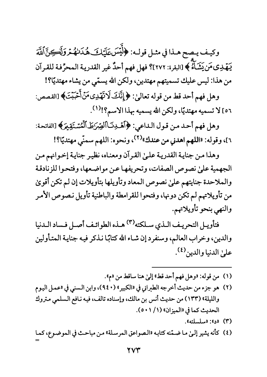 وكيف يصح هذا في مثل قوله: {لَيْسَ عَلَيْكَ هُدَاهُمْ وَلَكِنَّ اللَّهَ يَهْدِي مَنْ يَشَاءُ} [البقرة: ٢٧٢]؟ فهل فهم أحدٌ غير القدرية المحرِّفة للقرآن من هذا: ليس عليك تسميتهم مهتدين، ولكن الله يسمّي من يشاء مهتديًا؟!
