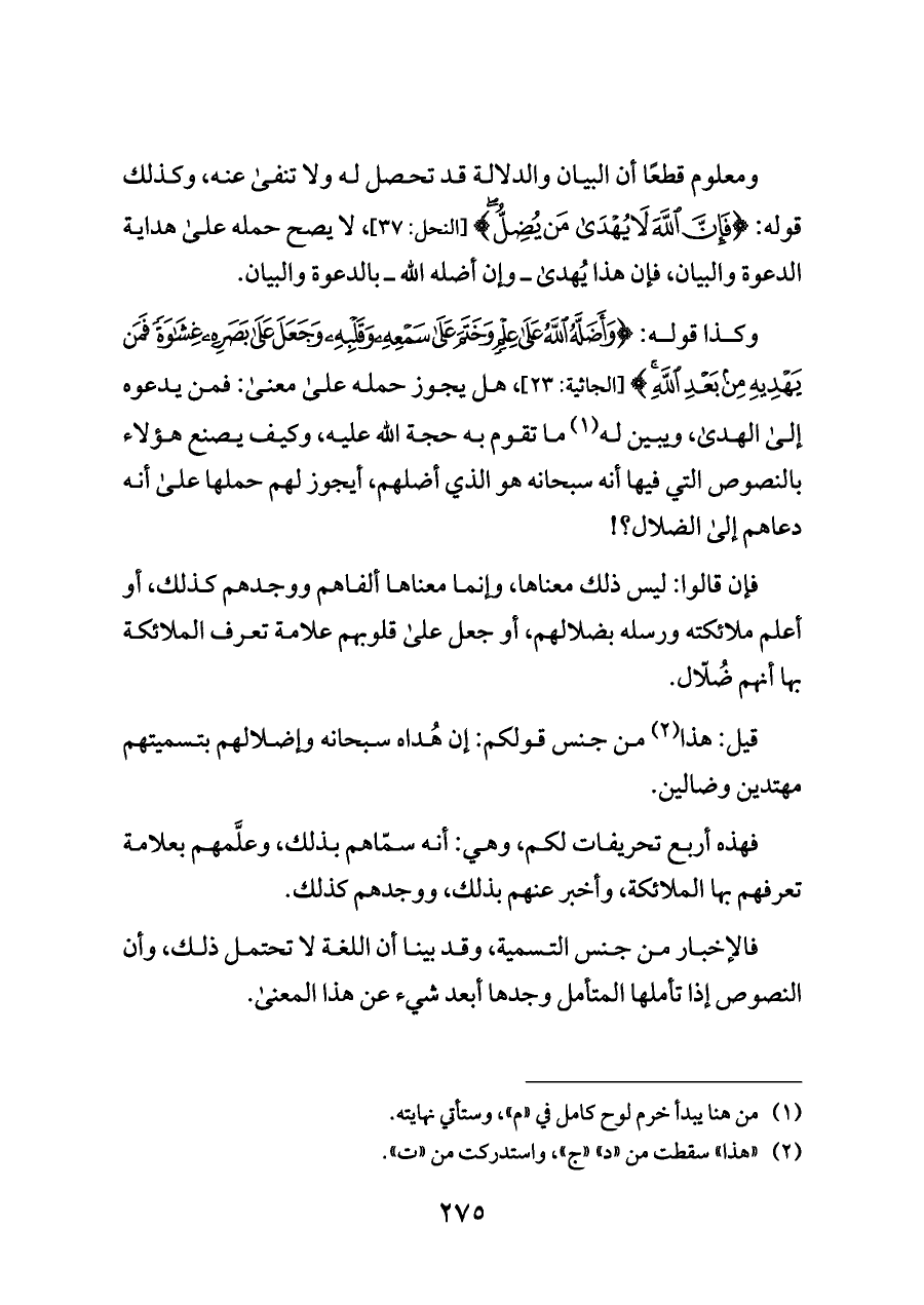 ومعلوم قطعًا أن البيان والدلالة قد تحصل له ولا تنفى عنه، وكذلك قوله: {فَإِنَّ اللَّهَ لَا يُهْدَى مَنْ يُضِلُّ} [النحل: ٣٧]، لا يصح حمله على هداية الدعوة والبيان، فإن هذا يُهدى ــ وإن أضله الله ــ بالدعوة والبيان.