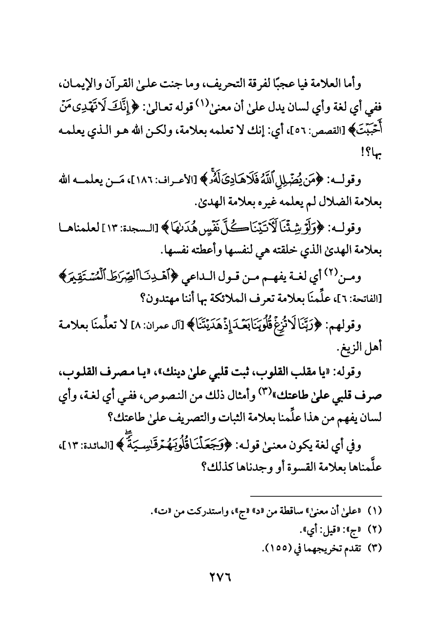وأما العلامة فيا عجبًا لفرقة التحريف، وما جنت على القرآن والإيمان، ففي أي لغة وأي لسان يدل على أن معنى (¬١) قوله تعالى: {إِنَّكَ لَا تَهْدِي مَنْ أَحْبَبْتَ} [القصص: ٥٦]، أي: إنك لا تعلمه بعلامة، ولكن الله هو الذي يعلمه بها؟!