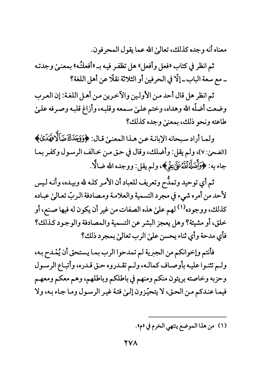 ثم انظر هل قال أحد من الأولين والآخرين من أهل اللغة: إن العرب وضعت أضلّه الله وهداه، وختم على سمعه وقلبه، وأزاغ قلبه وصرفه على طاعته ونحو ذلك، بمعنى وجده كذلك؟