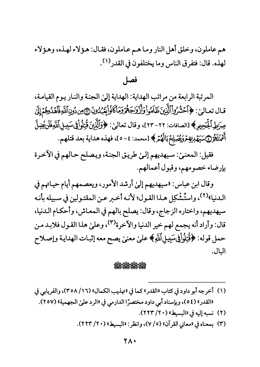 المرتبة الرابعة من مراتب الهداية: الهداية إلى الجنة والنار يوم القيامة، قال تعالى: {احْشُرُوا الَّذِينَ ظَلَمُوا وَأَزْوَاجَهُمْ وَمَا كَانُوا يَعْبُدُونَ (٢٢) مِنْ دُونِ اللَّهِ فَاهْدُوهُمْ إِلَى صِرَاطِ الْجَحِيمِ} [الصافات: ٢٢ - ٢٣]، وقال تعالى: {وَالَّذِينَ قُتِلُوا فِي سَبِيلِ اللَّهِ فَلَنْ يُضِلَّ أَعْمَالَهُمْ (٤) سَيَهْدِيهِمْ وَيُصْلِحُ بَالَهُمْ} [محمد: ٤ - ٥]، فهذه هداية بعد قتلهم.