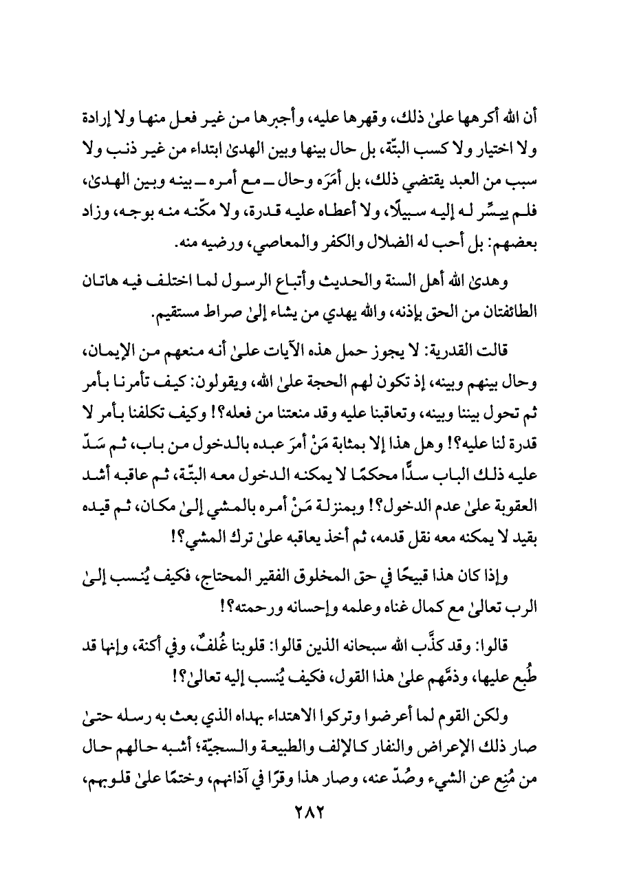 قالت القدرية: لا يجوز حمل هذه الآيات على أنه منعهم من الإيمان، وحال بينهم وبينه، إذ تكون لهم الحجة على الله، ويقولون: كيف تأمرنا بأمر ثم تحول بيننا وبينه، وتعاقبنا عليه وقد منعتنا من فعله؟! وكيف تكلفنا بأمر لا قدرة لنا عليه؟! وهل هذا إلا بمثابة مَنْ أمرَ عبده بالدخول من باب، ثم سَدّ عليه ذلك الباب سدًّا محكمًا لا يمكنه الدخول معه البتّة، ثم عاقبه أشد العقوبة على عدم الدخول؟! وبمنزلة مَنْ أمره بالمشي إلى مكان، ثم قيده بقيد لا يمكنه معه نقل قدمه، ثم أخذ يعاقبه على ترك المشي؟!