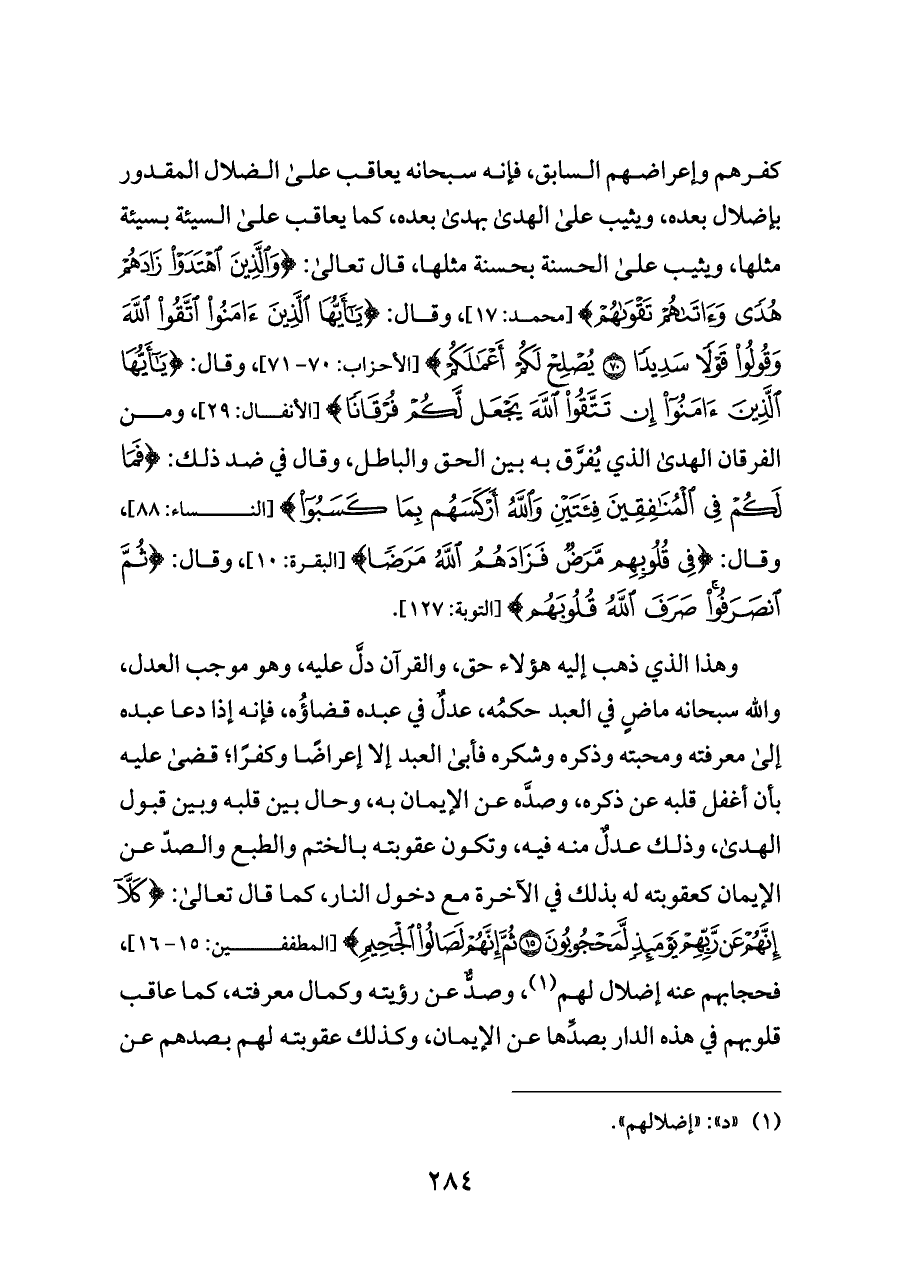 وهذا الذي ذهب إليه هؤلاء حق، والقرآن دلَّ عليه، وهو موجب العدل، والله سبحانه ماضٍ في العبد حكمُه، عدلٌ في عبده قضاؤُه، فإنه إذا دعا عبده إلى معرفته ومحبته وذكره وشكره فأبى العبد إلا إعراضًا وكفرًا؛ قضى عليه بأن أغفل قلبه عن ذكره، وصدَّه عن الإيمان به، وحال بين قلبه وبين قبول الهدى، وذلك عدلٌ منه فيه، وتكون عقوبته بالختم والطبع والصدّ عن الإيمان كعقوبته له بذلك في الآخرة مع دخول النار، كما قال تعالى: {كَلَّا إِنَّهُمْ عَنْ رَبِّهِمْ يَوْمَئِذٍ لَمَحْجُوبُونَ (١٥) ثُمَّ إِنَّهُمْ لَصَالُو الْجَحِيمِ} [المطففين: ١٥ - ١٦]، فحجابهم عنه إضلال لهم (¬١)، وصدٌّ عن رؤيته وكمال معرفته، كما عاقب قلوبهم في هذه الدار بصدِّها عن الإيمان، وكذلك عقوبته لهم بصدهم عن