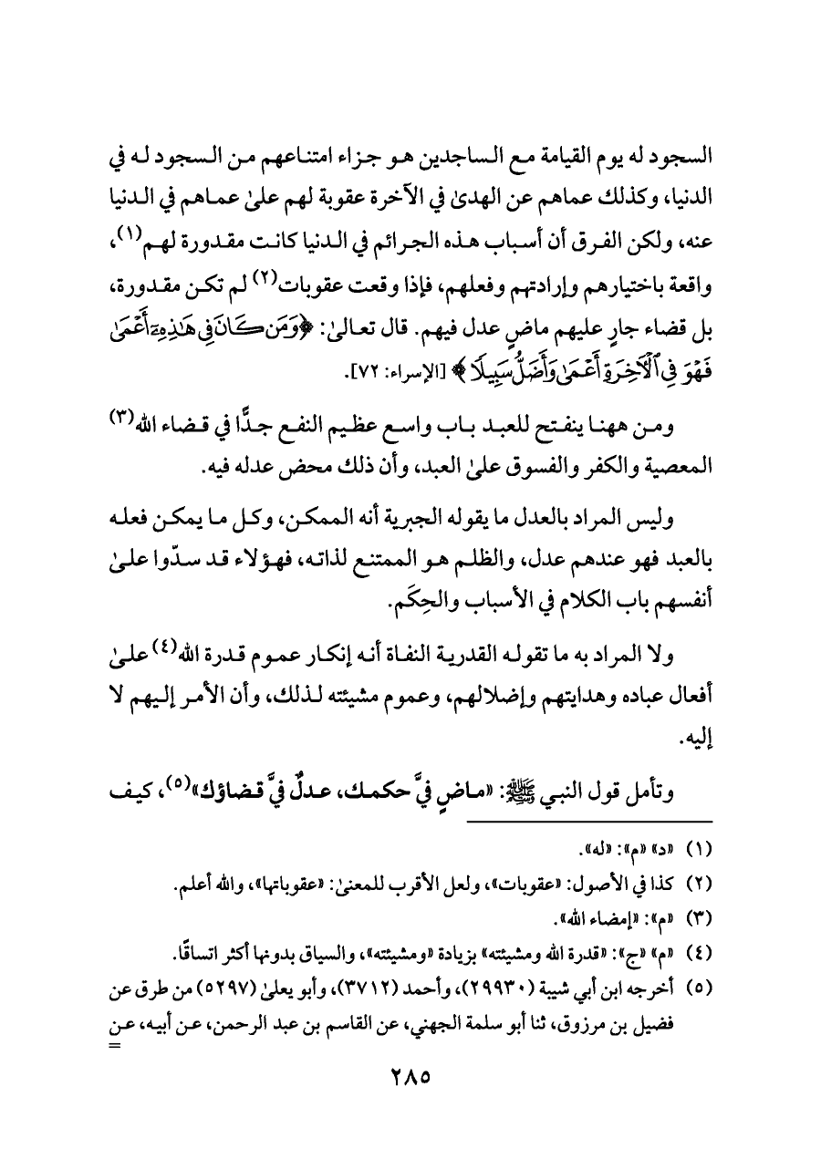 السجود له يوم القيامة مع الساجدين هو جزاء امتناعهم من السجود له في الدنيا، وكذلك عماهم عن الهدى في الآخرة عقوبة لهم على عماهم في الدنيا عنه، ولكن الفرق أن أسباب هذه الجرائم في الدنيا كانت مقدورة لهم (¬١)، واقعة باختيارهم وإرادتهم وفعلهم، فإذا وقعت عقوبات (¬٢) لم تكن مقدورة، بل قضاء جارٍ عليهم ماضٍ عدل فيهم. قال تعالى: {(٧١) وَمَنْ كَانَ فِي هَذِهِ فَهْوَ فَهُوَ فِي الْآخِرَةِ أَعْمَى وَأَضَلُّ} [الإسراء: ٧٢].
