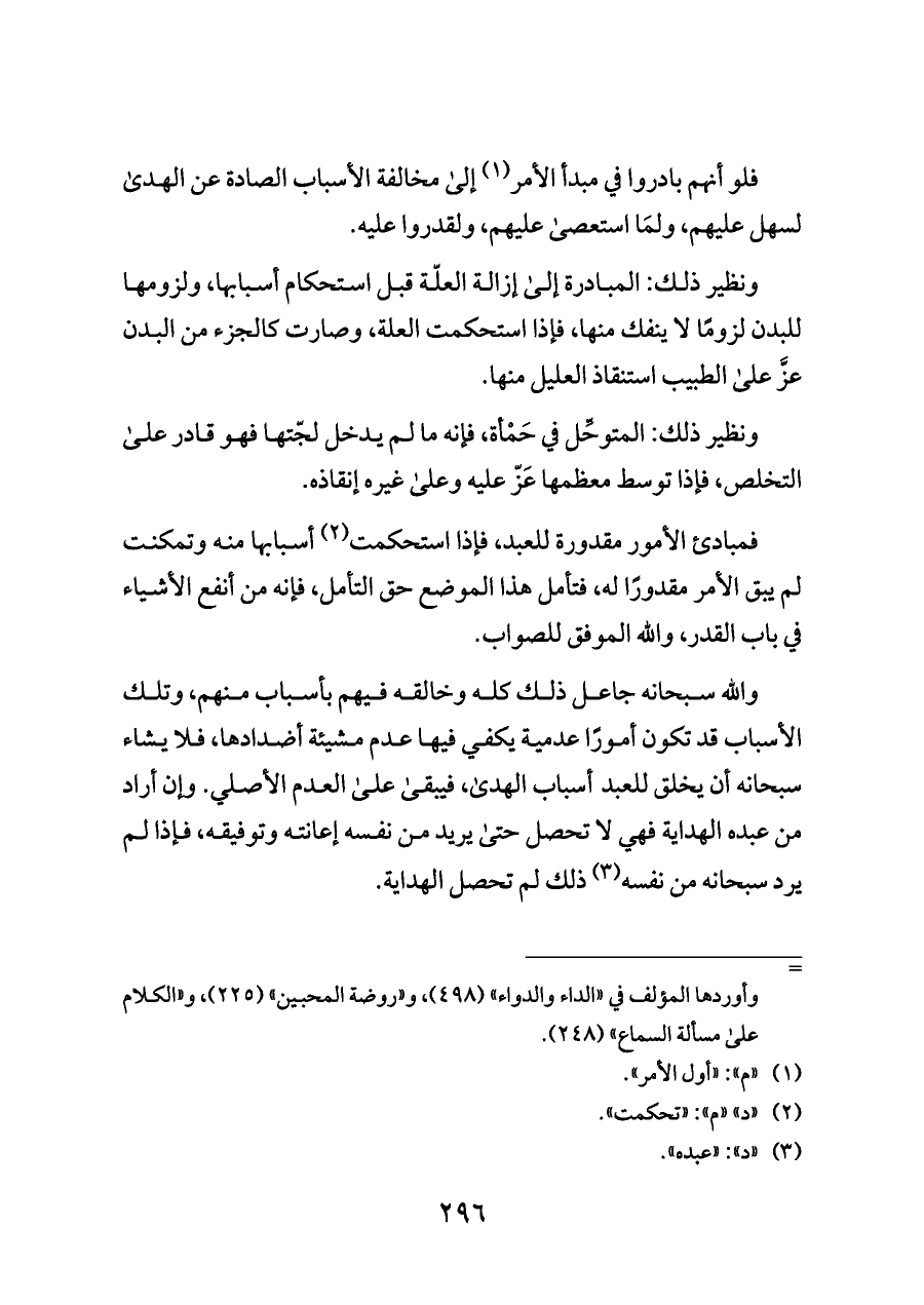 فمبادئ الأمور مقدورة للعبد، فإذا استحكمت (¬٢) أسبابها منه وتمكنت لم يبق الأمر مقدورًا له، فتأمل هذا الموضع حق التأمل، فإنه من أنفع الأشياء في باب القدر، والله الموفق للصواب.