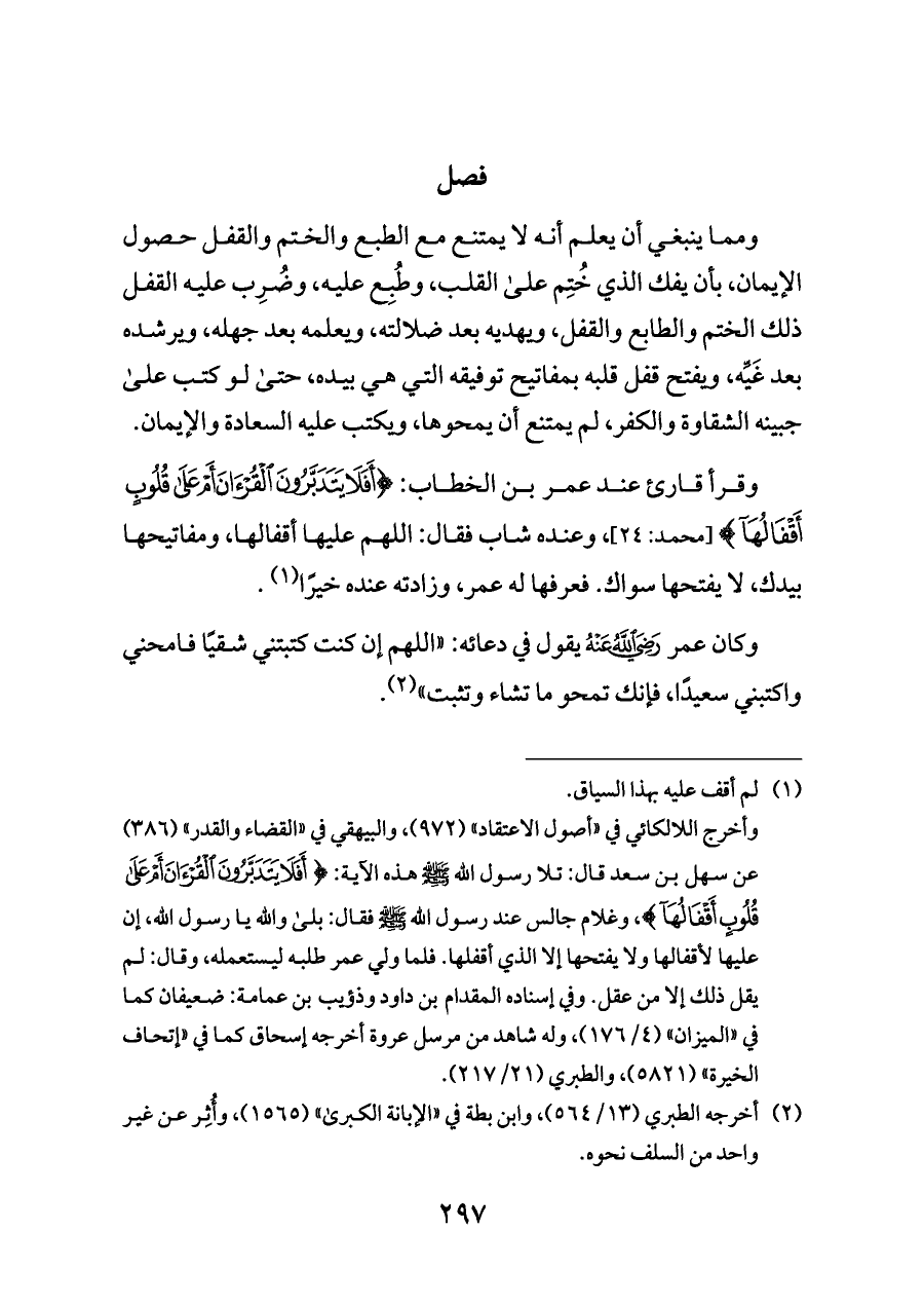 وقرأ قارئ عند عمر بن الخطاب: {(٢٣) أَفَلَا يَتَدَبَّرُونَ الْقُرْآنَ أَمْ عَلَى قُلُوبٍ} [محمد: ٢٤]، وعنده شاب فقال: اللهم عليها أقفالها، ومفاتيحها بيدك، لا يفتحها سواك. فعرفها له عمر، وزادته عنده خيرًا (¬١).