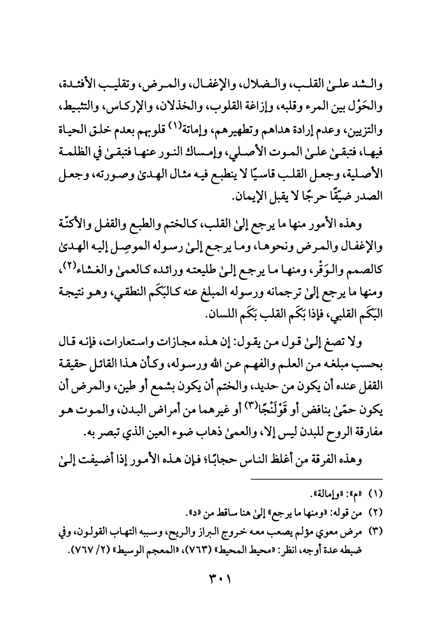 ولا تصغ إلى قول من يقول: إن هذه مجازات واستعارات، فإنه قال بحسب مبلغه من العلم والفهم عن الله ورسوله، وكأن هذا القائل حقيقة القفل عنده أن يكون من حديد، والختم أن يكون بشمع أو طين، والمرض أن يكون حمّى بنافض أو قَوْلَنْجًا (¬٣) أو غيرهما من أمراض البدن، والموت هو مفارقة الروح للبدن ليس إلا، والعمى ذهاب ضوء العين الذي تبصر به.