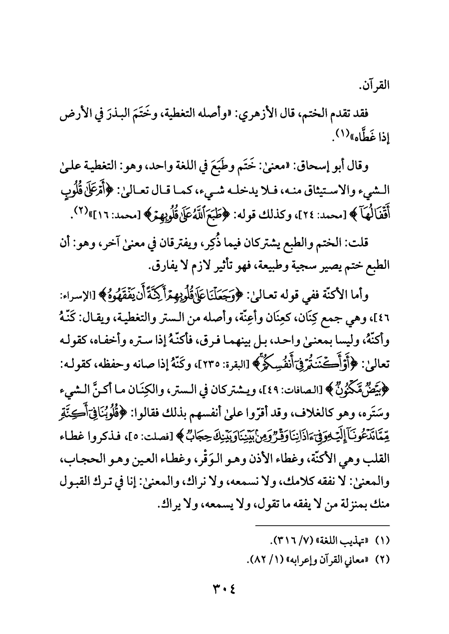 وقال أبو إسحاق: "معنى: خَتَم وطَبَعَ في اللغة واحد، وهو: التغطية على الشيء والاستيثاق منه، فلا يدخله شيء، كما قال تعالى: {الْقُرْآنَ أَمْ عَلَى قُلُوبٍ} [محمد: ٢٤]، وكذلك قوله: {طَبَعَ اللَّهُ عَلَى قُلُوبِهِمْ} [محمد: ١٦] " (¬٢).