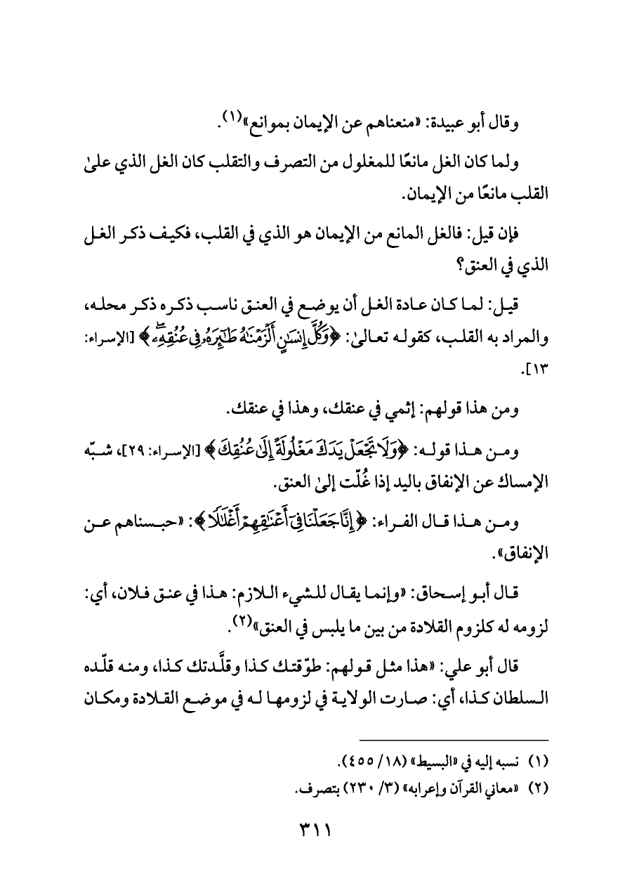 ومن هذا قال الفراء: {إِنَّا جَعَلْنَا فِي أَعْنَاقِهِمْ أَغْلَالًا}: "حبسناهم عن الإنفاق".