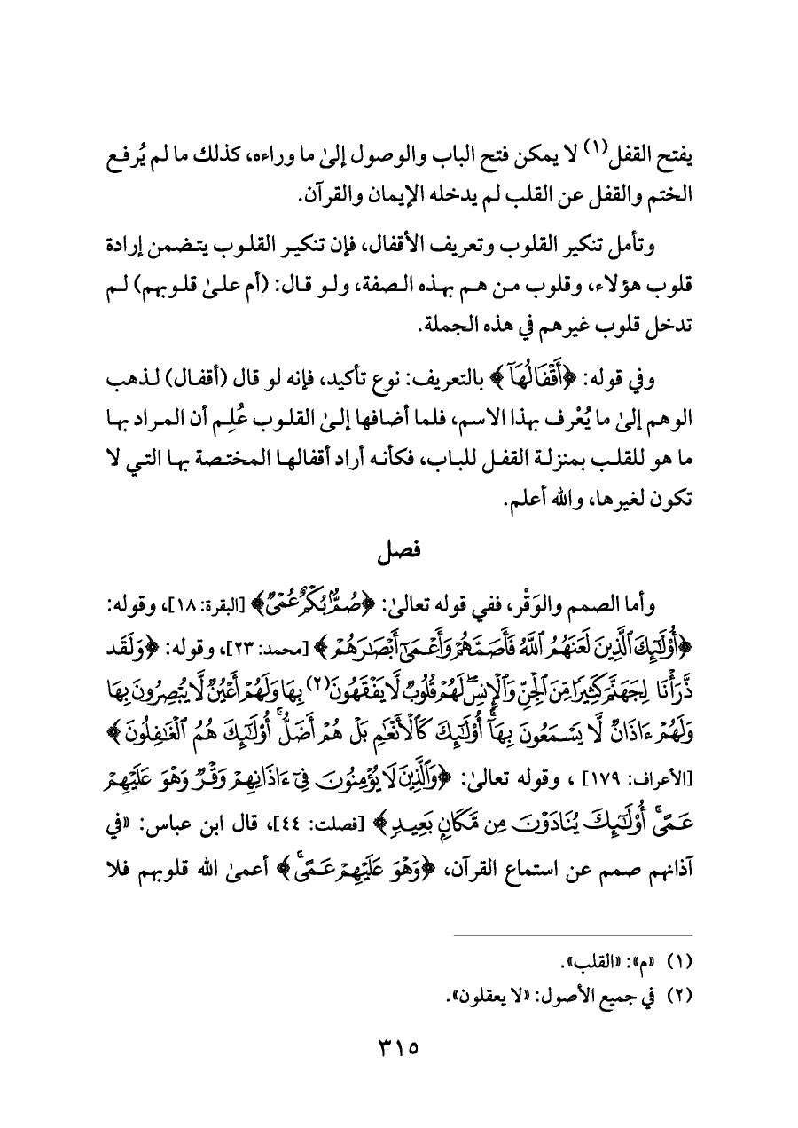 وتأمل تنكير القلوب وتعريف الأقفال، فإن تنكير القلوب يتضمن إرادة قلوب هؤلاء، وقلوب من هم بهذه الصفة، ولو قال: (أم على قلوبهم) لم تدخل قلوب غيرهم في هذه الجملة.