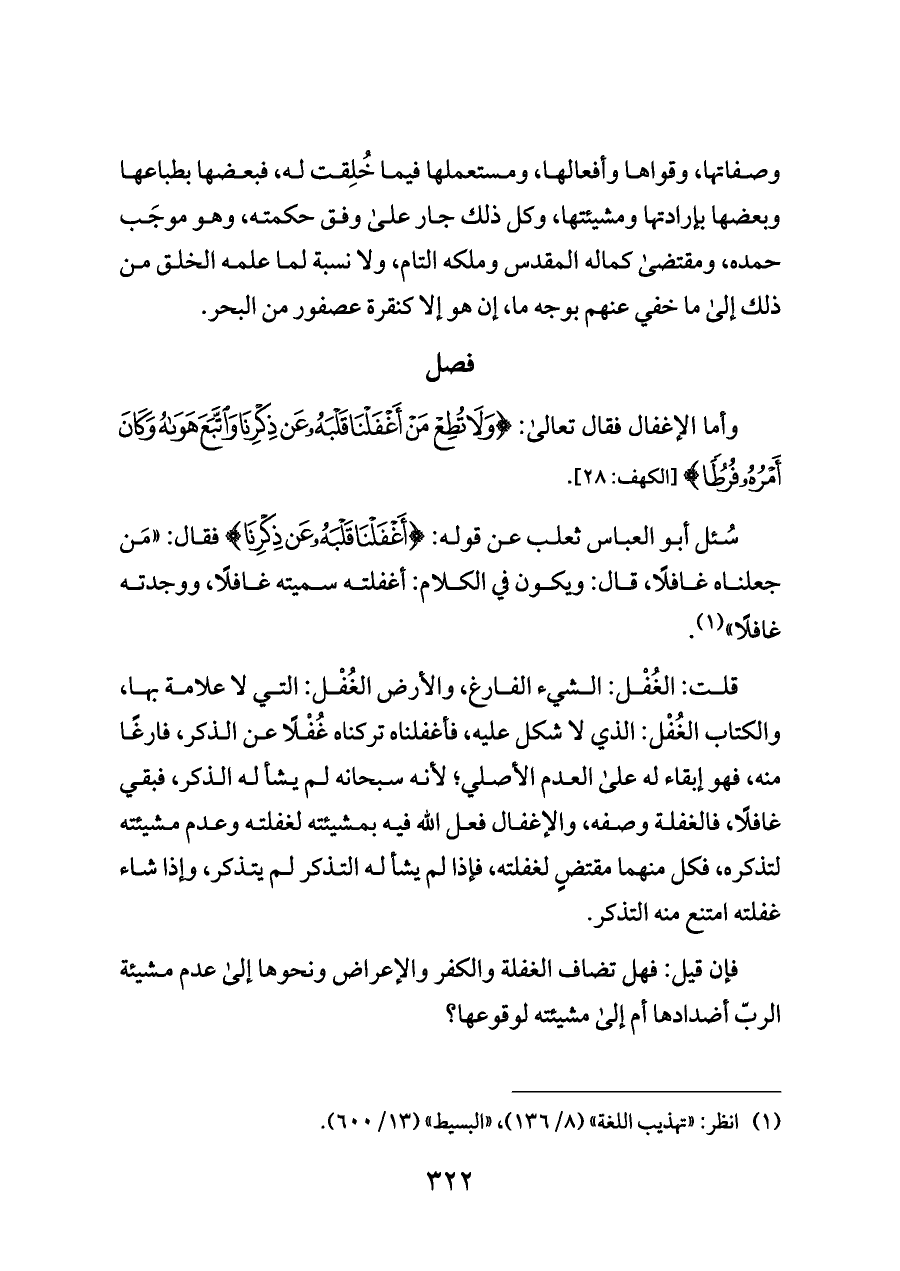 قلت: الغُفْل: الشيء الفارغ، والأرض الغُفْل: التي لا علامة بها، والكتاب الغُفْل: الذي لا شكل عليه، فأغفلناه تركناه غُفْلًا عن الذكر، فارغًا منه، فهو إبقاء له على العدم الأصلي؛ لأنه سبحانه لم يشأ له الذكر، فبقي غافلًا، فالغفلة وصفه، والإغفال فعل الله فيه بمشيئته لغفلته وعدم مشيئته لتذكره، فكل منهما مقتضٍ لغفلته، فإذا لم يشأ له التذكر لم يتذكر، وإذا شاء غفلته امتنع منه التذكر.