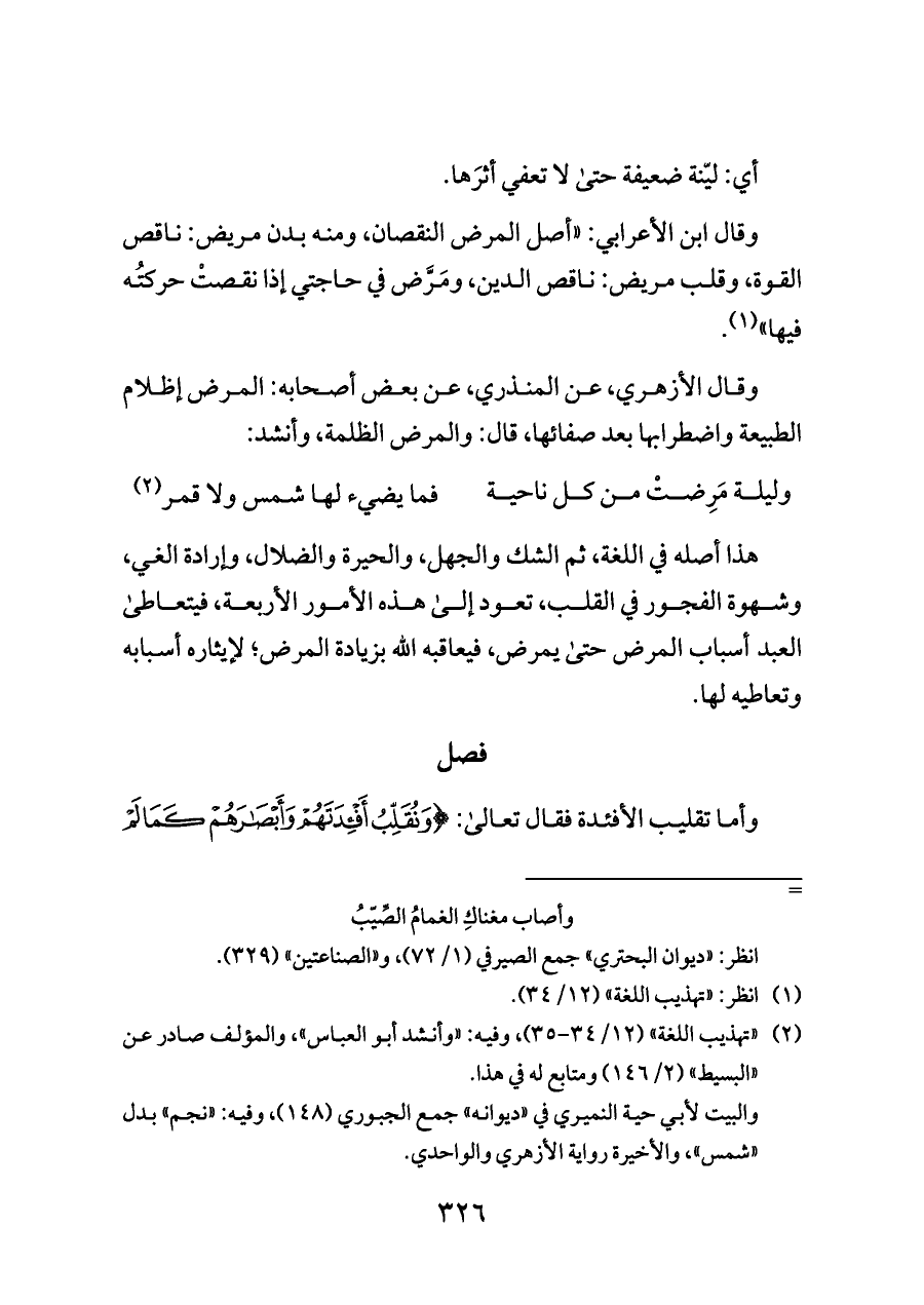 وقال الأزهري، عن المنذري، عن بعض أصحابه: المرض إظلام الطبيعة واضطرابها بعد صفائها، قال: والمرض الظلمة، وأنشد: