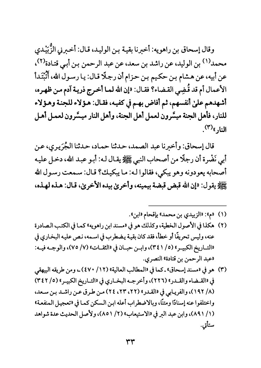 وقال إسحاق بن راهويه: أخبرنا بقية بن الوليد، قال: أخبرني الزُّبَيْدي محمد (¬١) بن الوليد، عن راشد بن سعد، عن عبد الرحمن بن أبي قتادة (¬٢)، عن أبيه، عن هشام بن حكيم بن حزام أن رجلًا قال: يا رسول الله، أَتُبْتَدأ الأعمال أم قد قُضِي القضاء؟ فقال: "إن الله لما أخرج ذرية آدم من ظهره، أشهدهم على أنفسهم، ثم أفاض بهم في كفيه، فقال: هؤلاء للجنة وهؤلاء للنار، فأهل الجنة ميسَّرون لعمل أهل الجنة، وأهل النار ميسَّرون لعمل أهل النار" (¬٣).