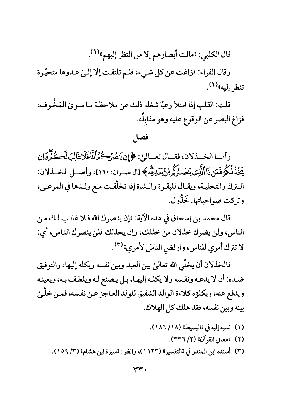 وأما الخذلان، فقال تعالى: {إِنْ يَنْصُرْكُمُ اللَّهُ فَلَا غَالِبَ لَكُمْ وَإِنْ يَخْذُلْكُمْ فَمَنْ ذَا الَّذِي يَنْصُرُكُمْ مِنْ بَعْدِهِ} [آل عمران: ١٦٠]، وأصل الخذلان: الترك والتخلية، ويقال للبقرة والشاة إذا تخلّفت مع ولدها في المرعى، وتركت صواحباتها: خَذُول.