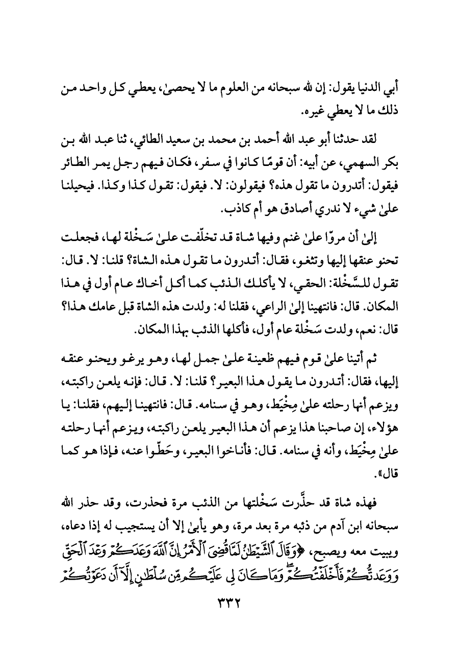 فهذه شاة قد حذَّرت سَخْلتها من الذئب مرة فحذرت، وقد حذر الله سبحانه ابن آدم من ذئبه مرة بعد مرة، وهو يأبى إلا أن يستجيب له إذا دعاه، ويبيت معه ويصبح، {وَقَالَ الشَّيْطَانُ لَمَّا قُضِيَ الْأَمْرُ إِنَّ اللَّهَ وَعَدَكُمْ وَعْدَ الْحَقِّ وَوَعَدْتُكُمْ فَأَخْلَفْتُكُمْ وَمَا كَانَ لِي عَلَيْكُمْ مِنْ سُلْطَانٍ إِلَّا أَنْ دَعَوْتُكُمْ