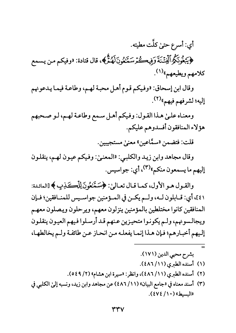 {يَبْغُونَكُمُ الْفِتْنَةَ وَفِيكُمْ سَمَّاعُونَ لَهُمْ}، قال قتادة: "وفيكم من يسمع كلامهم ويطيعهم" (¬١).
