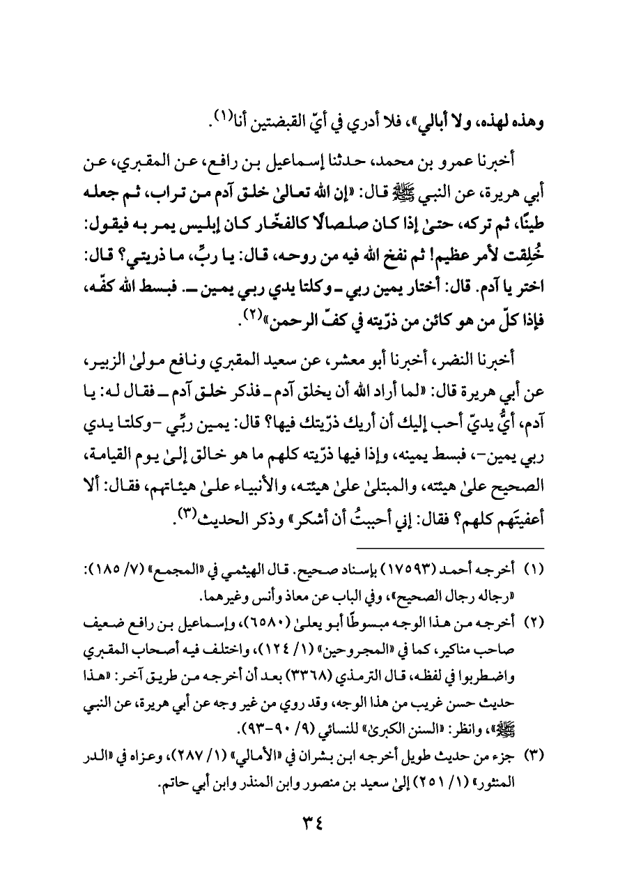 أخبرنا عمرو بن محمد، حدثنا إسماعيل بن رافع، عن المقبري، عن أبي هريرة، عن النبي - صلى الله عليه وسلم - قال: "إن الله تعالى خلق آدم من تراب، ثم جعله طينًا، ثم تركه، حتى إذا كان صلصالًا كالفخّار كان إبليس يمر به فيقول: خُلِقت لأمر عظيم! ثم نفخ الله فيه من روحه، قال: يا ربِّ، ما ذريتي؟ قال: اختر يا آدم. قال: أختار يمين ربي ــ وكلتا يدي ربي يمين ــ. فبسط الله كفّه، فإذا كلّ من هو كائن من ذرّيته في كفّ الرحمن" (¬٢).
