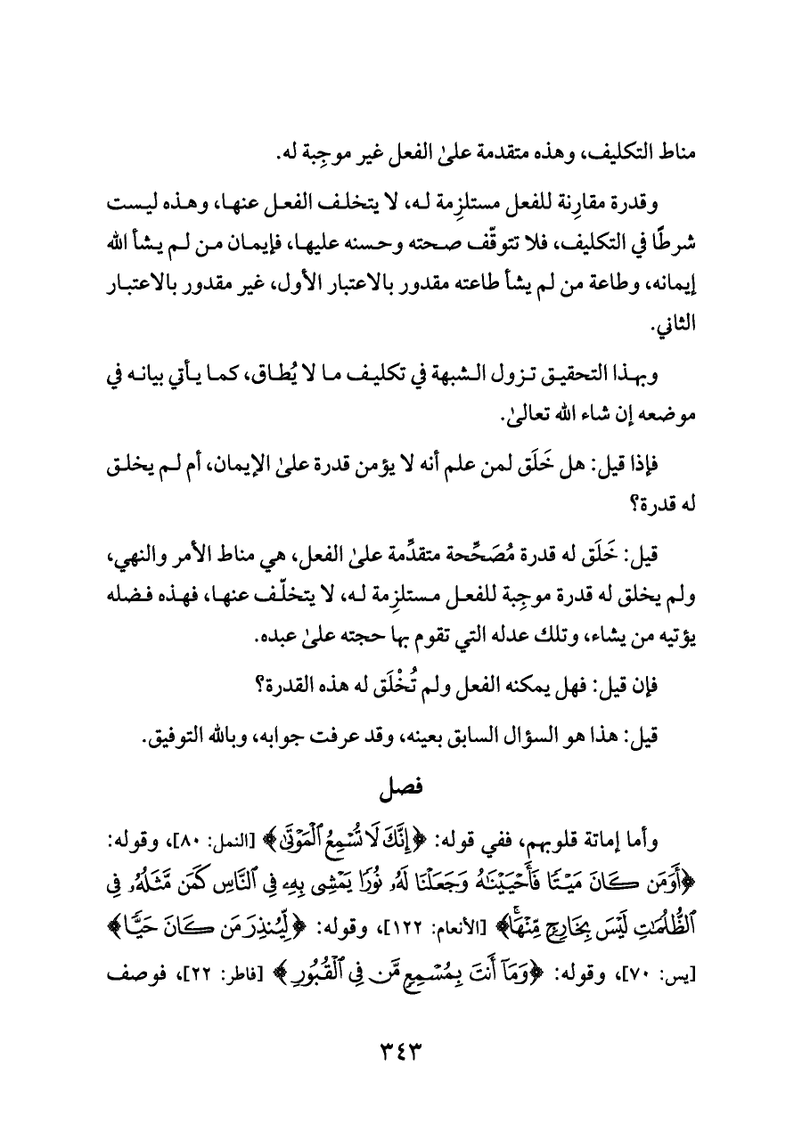 وقدرة مقارِنة للفعل مستلزِمة له، لا يتخلف الفعل عنها، وهذه ليست شرطًا في التكليف، فلا تتوقّف صحته وحسنه عليها، فإيمان من لم يشأ الله إيمانه، وطاعة من لم يشأ طاعته مقدور بالاعتبار الأول، غير مقدور بالاعتبار الثاني.