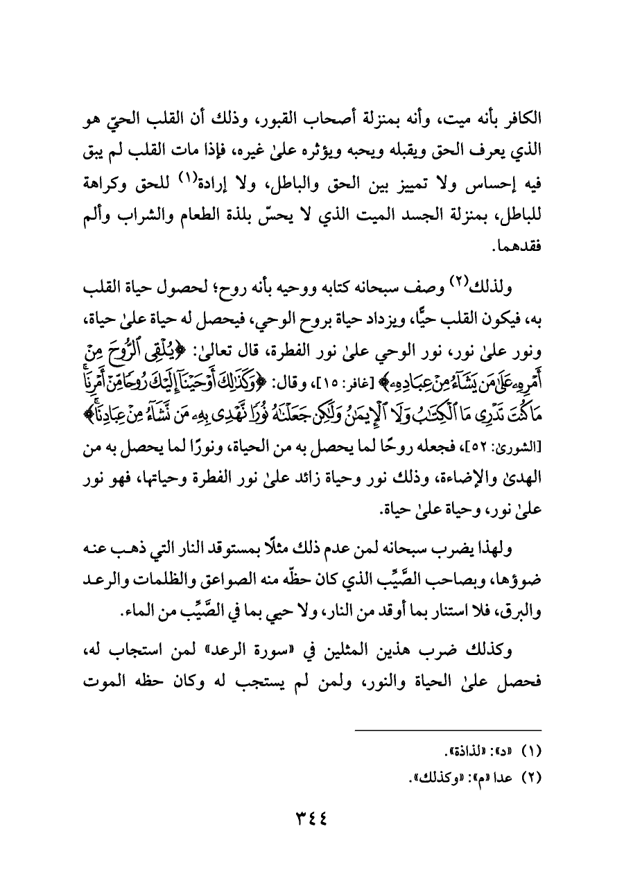 ولذلك (¬٢) وصف سبحانه كتابه ووحيه بأنه روح؛ لحصول حياة القلب به، فيكون القلب حيًّا، ويزداد حياة بروح الوحي، فيحصل له حياة على حياة، ونور على نور، نور الوحي على نور الفطرة، قال تعالى: {الْعَرْشِ يُلْقِي الرُّوحَ مِنْ أَمْرِهِ عَلَى مَنْ يَشَاءُ مِنْ} [غافر: ١٥]، وقال: {وَكَذَلِكَ أَوْحَيْنَا إِلَيْكَ رُوحًا مِنْ أَمْرِنَا مَا كُنْتَ تَدْرِي مَا الْكِتَابُ وَلَا الْإِيمَانُ وَلَكِنْ جَعَلْنَاهُ نُورًا نَهْدِي بِهِ مَنْ نَشَاءُ مِنْ عِبَادِنَا} [الشورى: ٥٢]، فجعله روحًا لما يحصل به من الحياة، ونورًا لما يحصل به من الهدى والإضاءة، وذلك نور وحياة زائد على نور الفطرة وحياتها، فهو نور على نور، وحياة على حياة.