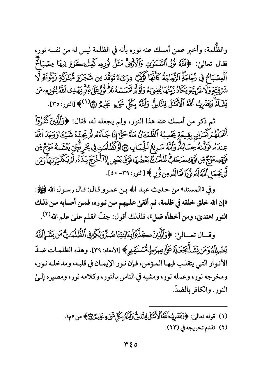 والظُّلمة، وأخبر عمن أمسك عنه نوره بأنه في الظلمة ليس له من نفسه نور، فقال تعالى: {اللَّهُ نُورُ السَّمَاوَاتِ وَالْأَرْضِ مَثَلُ نُورِهِ كَمِشْكَاةٍ فِيهَا مِصْبَاحٌ الْمِصْبَاحُ فِي زُجَاجَةٍ الزُّجَاجَةُ كَأَنَّهَا كَوْكَبٌ دِرِّيءٌ تَوَقَّدَ مِنْ شَجَرَةٍ مُبَارَكَةٍ زَيْتُونَةٍ لَا شَرْقِيَّةٍ وَلَا غَرْبِيَّةٍ يَكَادُ زَيْتُهَا يُضِيءُ وَلَوْ لَمْ تَمْسَسْهُ نَارٌ نُورٌ عَلَى نُورٍ يَهْدِي اللَّهُ لِنُورِهِ مَنْ يَشَاءُ وَيَضْرِبُ اللَّهُ الْأَمْثَالَ لِلنَّاسِ وَاللَّهُ بِكُلِّ شَيْءٍ عَلِيمٌ (٣٥) (¬١)} [النور: ٣٥].