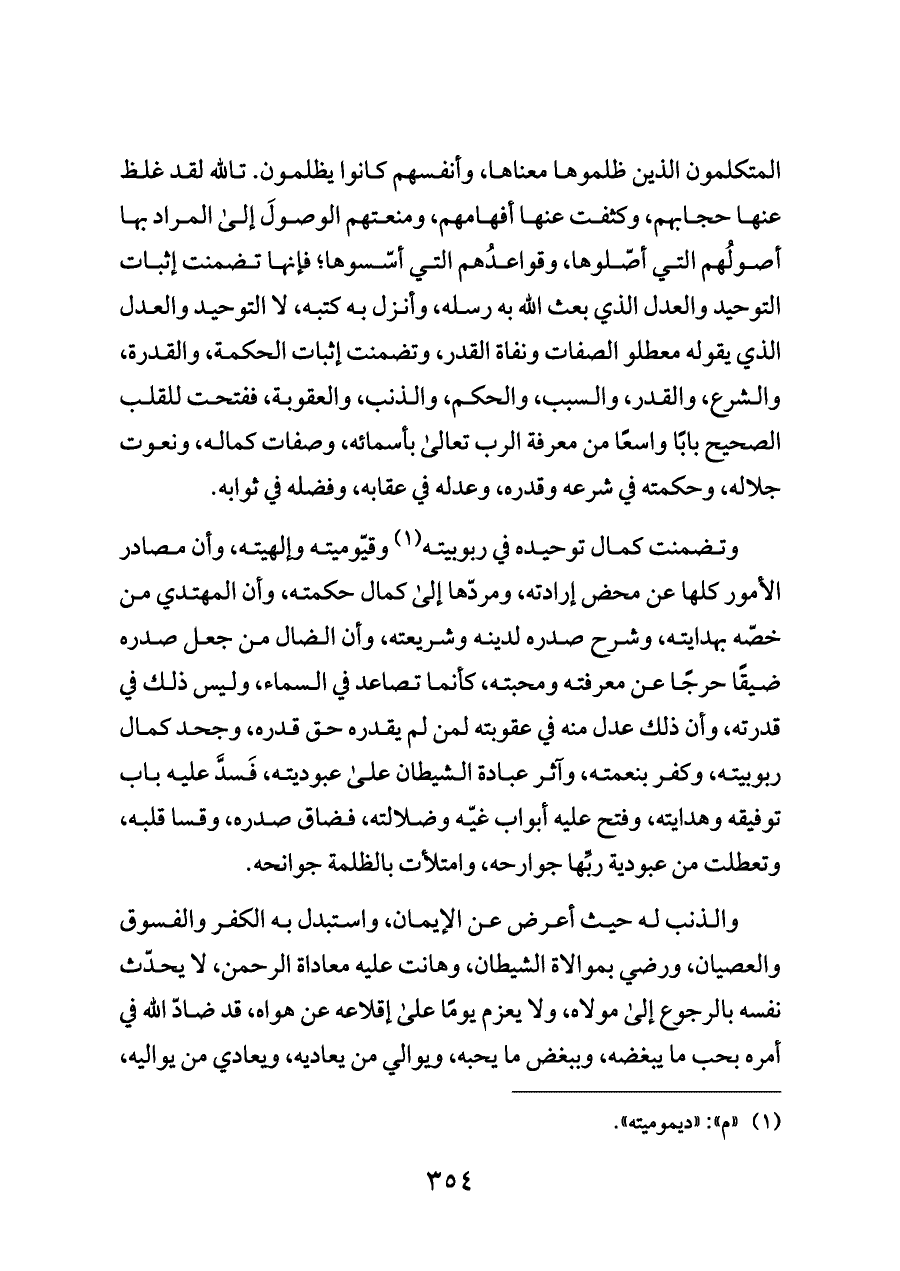 المتكلمون الذين ظلموها معناها، وأنفسهم كانوا يظلمون. تالله لقد غلظ عنها حجابهم، وكثفت عنها أفهامهم، ومنعتهم الوصولَ إلى المراد بها أصولُهم التي أصّلوها، وقواعدُهم التي أسّسوها؛ فإنها تضمنت إثبات التوحيد والعدل الذي بعث الله به رسله، وأنزل به كتبه، لا التوحيد والعدل الذي يقوله معطلو الصفات ونفاة القدر، وتضمنت إثبات الحكمة، والقدرة، والشرع، والقدر، والسبب، والحكم، والذنب، والعقوبة، ففتحت للقلب الصحيح بابًا واسعًا من معرفة الرب تعالى بأسمائه، وصفات كماله، ونعوت جلاله، وحكمته في شرعه وقدره، وعدله في عقابه، وفضله في ثوابه.