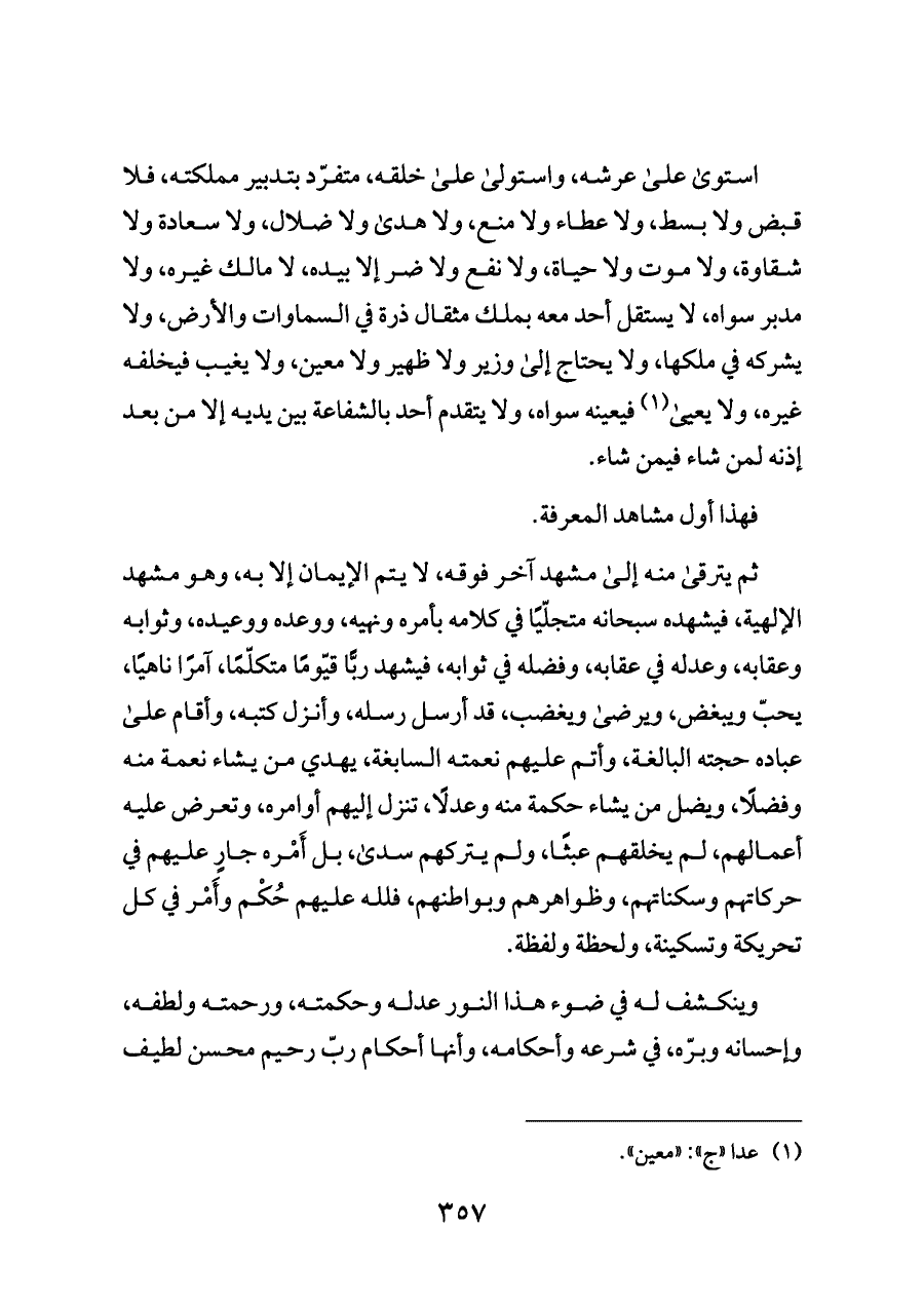 ثم يترقى منه إلى مشهد آخر فوقه، لا يتم الإيمان إلا به، وهو مشهد الإلهية، فيشهده سبحانه متجلّيًا في كلامه بأمره ونهيه، ووعده ووعيده، وثوابه وعقابه، وعدله في عقابه، وفضله في ثوابه، فيشهد ربًّا قيّومًا متكلّمًا، آمرًا ناهيًا، يحبّ ويبغض، ويرضى ويغضب، قد أرسل رسله، وأنزل كتبه، وأقام على عباده حجته البالغة، وأتم عليهم نعمته السابغة، يهدي من يشاء نعمة منه وفضلًا، ويضل من يشاء حكمة منه وعدلًا، تنزل إليهم أوامره، وتعرض عليه أعمالهم، لم يخلقهم عبثًا، ولم يتركهم سدى، بل أَمْره جارٍ عليهم في حركاتهم وسكناتهم، وظواهرهم وبواطنهم، فلله عليهم حُكْم وأَمْر في كل تحريكة وتسكينة، ولحظة ولفظة.