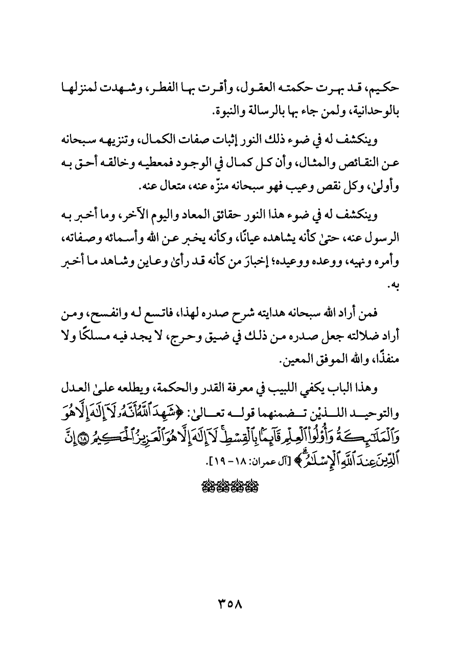 وهذا الباب يكفي اللبيب في معرفة القدر والحكمة، ويطلعه على العدل والتوحيد اللذيْن تضمنهما قوله تعالى: {شَهِدَ اللَّهُ أَنَّهُ لَا إِلَهَ إِلَّا هُوَ وَالْمَلَائِكَةُ وَأُولُو الْعِلْمِ قَائِمًا بِالْقِسْطِ لَا إِلَهَ إِلَّا هُوَ الْعَزِيزُ الْحَكِيمُ (١٨) إِنَّ الدِّينَ عِنْدَ اللَّهِ الْإِسْلَامُ} [آل عمران: ١٨ - ١٩].