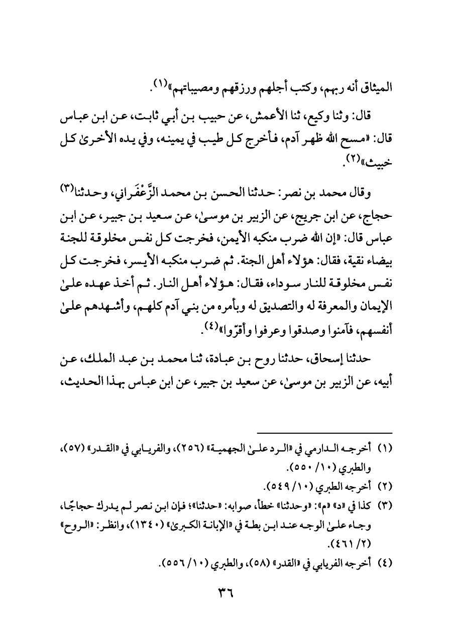 قال: وثنا وكيع، ثنا الأعمش، عن حبيب بن أبي ثابت، عن ابن عباس قال: "مسح الله ظهر آدم، فأخرج كل طيب في يمينه، وفي يده الأخرى كل خبيث" (¬٢).