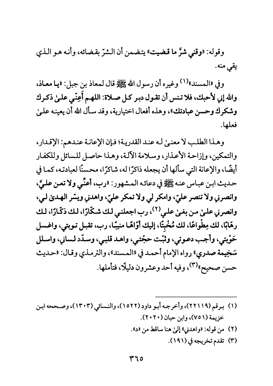 وهذا الطلب لا معنى له عند القدرية؛ فإن الإعانة عندهم: الإقدار، والتمكين، وإزاحة الأعذار، وسلامة الآلة، وهذا حاصل للسائل وللكفار أيضًا، والإعانة التي سألها أن يجعله ذاكرًا له، شاكرًا، محسنًا لعبادته، كما في حديث ابن عباس عنه - صلى الله عليه وسلم - في دعائه المشهور: "رب، أعنِّي ولا تعن عليَّ، وانصرني ولا تنصر عليّ، وامكر لي ولا تمكر عليّ، واهدني ويسّر الهدى لي، وانصرني على من بغى علي (¬٢)، رب اجعلني لك شكّارًا، لك ذكّارًا، لك رهّابًا، لك مِطْواعًا، لك مُخْبِتًا، إليك أوّاهًا منيبًا، رب، تقبل توبتي، واغسل حَوْبتي، وأجب دعوتي، وثبّت حجّتي، واهد قلبي، وسدّد لساني، واسلل سَخِيمة صدري" رواه الإمام أحمد في "المسند"، والترمذي وقال: "حديث حسن صحيح" (¬٣)، وفيه أحد وعشرون دليلًا، فتأملها.