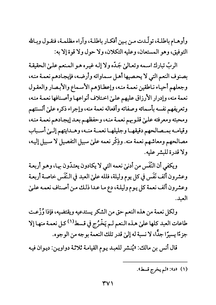 ويكفي أن النّفَس من أدنى نعمه التي لا يكادون يعتدّون بها، وهو أربعة وعشرون ألف نَفَس في كل يوم وليلة، فلله على العبد في النّفَس خاصة أربعة وعشرون ألف نعمة كل يوم وليلة، دع ما عدا ذلك من أصناف نعمه على العبد.