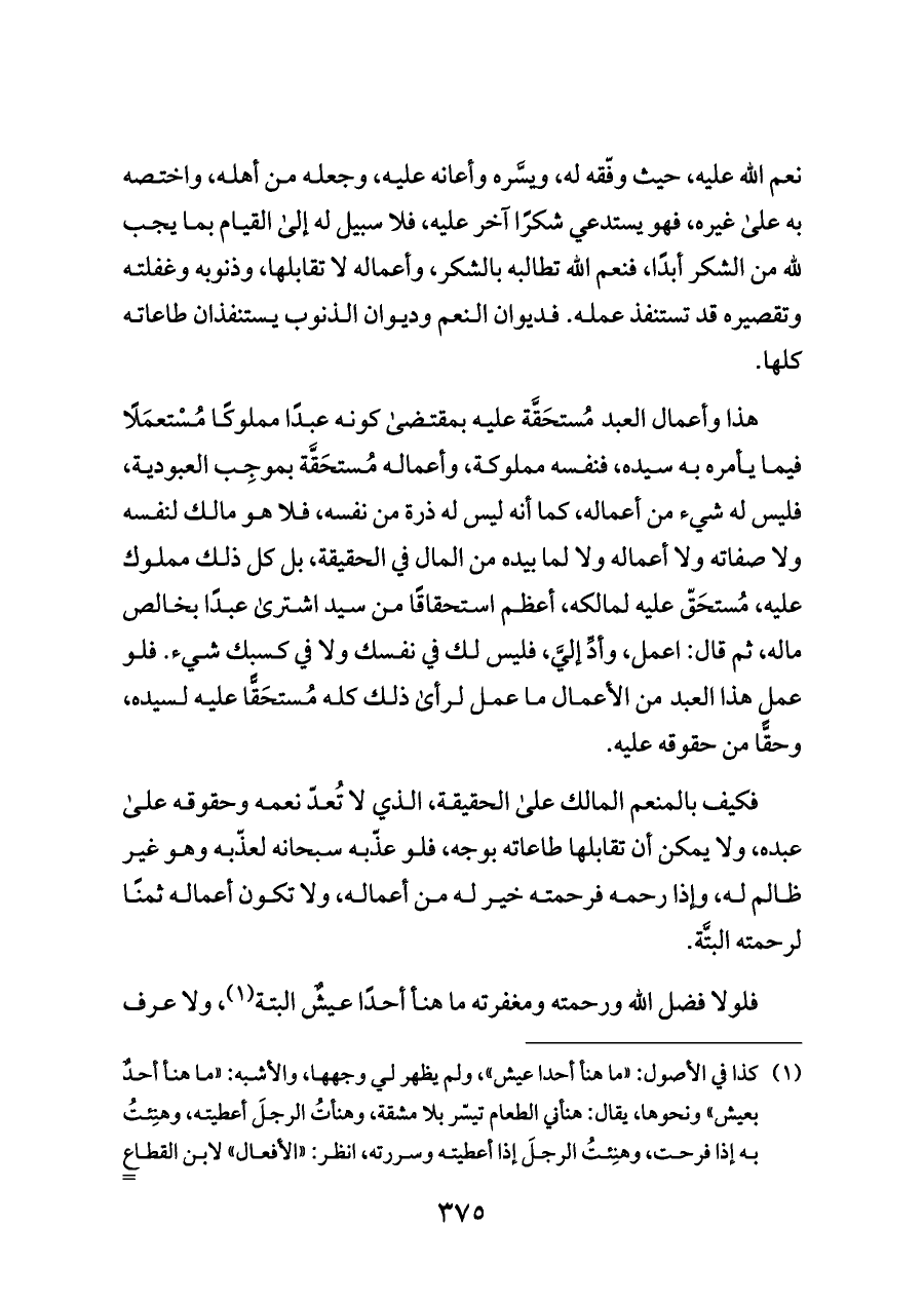 هذا وأعمال العبد مُستحَقَّة عليه بمقتضى كونه عبدًا مملوكًا مُسْتعمَلًا فيما يأمره به سيده، فنفسه مملوكة، وأعماله مُستحَقَّة بموجِب العبودية، فليس له شيء من أعماله، كما أنه ليس له ذرة من نفسه، فلا هو مالك لنفسه ولا صفاته ولا أعماله ولا لما بيده من المال في الحقيقة، بل كل ذلك مملوك عليه، مُستحَقّ عليه لمالكه، أعظم استحقاقًا من سيد اشترى عبدًا بخالص ماله، ثم قال: اعمل، وأدِّ إليَّ، فليس لك في نفسك ولا في كسبك شيء. فلو عمل هذا العبد من الأعمال ما عمل لرأى ذلك كله مُستحَقًّا عليه لسيده، وحقًّا من حقوقه عليه.