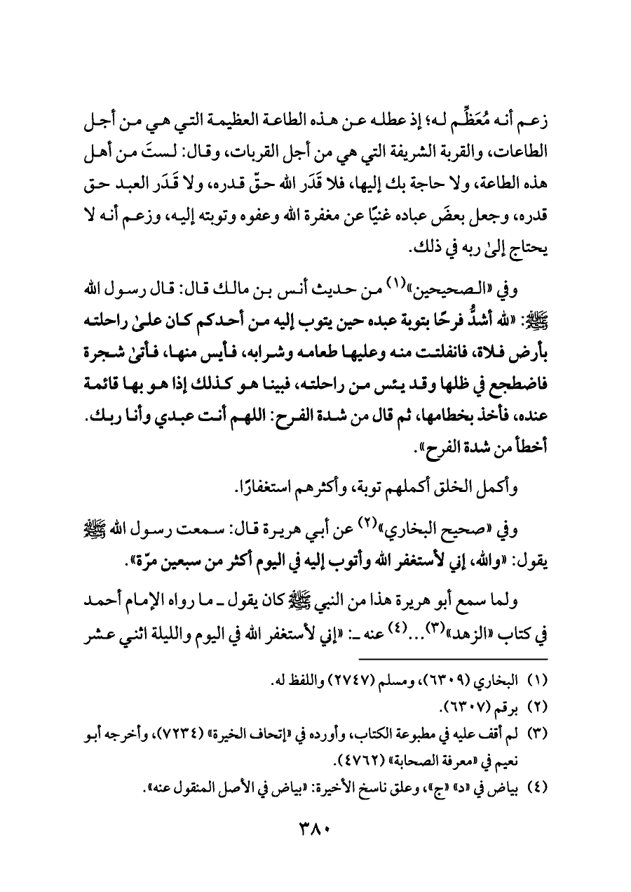 وفي "الصحيحين" (¬١) من حديث أنس بن مالك قال: قال رسول الله - صلى الله عليه وسلم -: "لله أشدُّ فرحًا بتوبة عبده حين يتوب إليه من أحدكم كان على راحلته بأرض فلاة، فانفلتت منه وعليها طعامه وشرابه، فأيس منها، فأتى شجرة فاضطجع في ظلها وقد يئس من راحلته، فبينا هو كذلك إذا هو بها قائمة عنده، فأخذ بخطامها، ثم قال من شدة الفرح: اللهم أنت عبدي وأنا ربك. أخطأ من شدة الفرح".