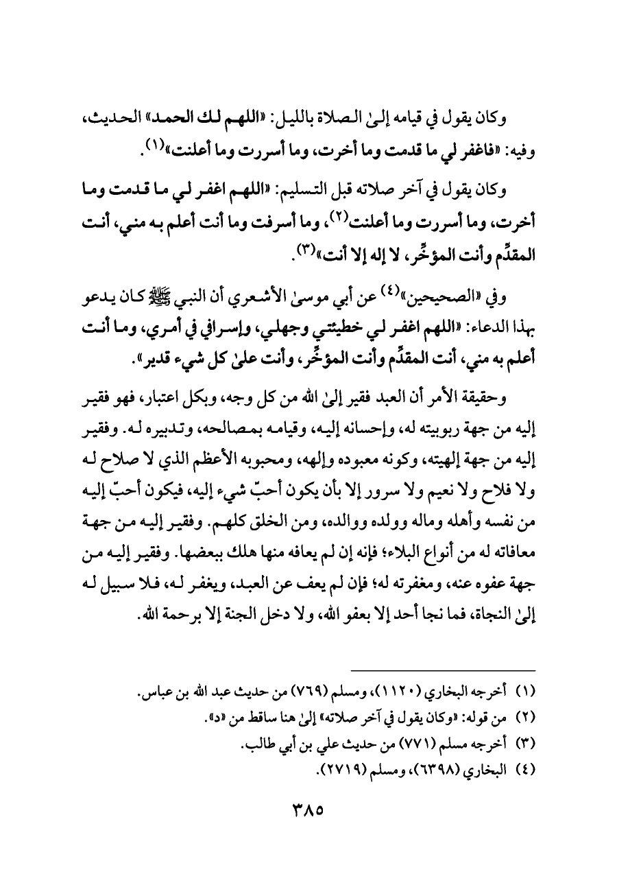 وحقيقة الأمر أن العبد فقير إلى الله من كل وجه، وبكل اعتبار، فهو فقير إليه من جهة ربوبيته له، وإحسانه إليه، وقيامه بمصالحه، وتدبيره له. وفقير إليه من جهة إلهيته، وكونه معبوده وإلهه، ومحبوبه الأعظم الذي لا صلاح له ولا فلاح ولا نعيم ولا سرور إلا بأن يكون أحبّ شيء إليه، فيكون أحبّ إليه من نفسه وأهله وماله وولده ووالده، ومن الخلق كلهم. وفقير إليه من جهة معافاته له من أنواع البلاء؛ فإنه إن لم يعافه منها هلك ببعضها. وفقير إليه من جهة عفوه عنه، ومغفرته له؛ فإن لم يعف عن العبد، ويغفر له، فلا سبيل له إلى النجاة، فما نجا أحد إلا بعفو الله، ولا دخل الجنة إلا برحمة الله.