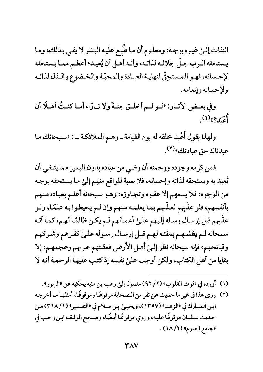 التفات إلى غيره بوجه، ومعلوم أن ما طُبِع عليه البشر لا يفي بذلك، وما يستحقه الرب جلّ جلاله لذاته، وأنه أهل أن يُعبد؛ أعظم مما يستحقه لإحسانه، فهو المستحِقّ لنهاية العبادة والمحبّة والخضوع والذل لذاته ولإحسانه وإنعامه.